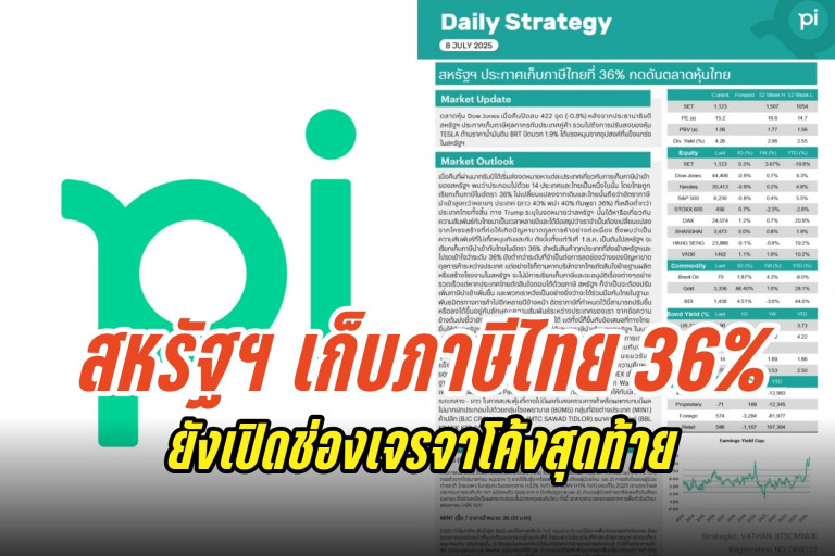 Pi Daily สหรัฐฯ ประกาศเก็บภาษีนำเข้าจากไทย 36% แต่ไม่ปิดช่องทางในการเจรจา ระยะสั้นสร้างแรงกดดันต่อกลุ่มส่งออกและกลุ่มนิคมอุตสาหกรรม แต่ยังเชื่อว่าบริเวณ 1060 +/- ยังเป็นแนวรับที่แข็งแกร่ง (Pbv 1x)