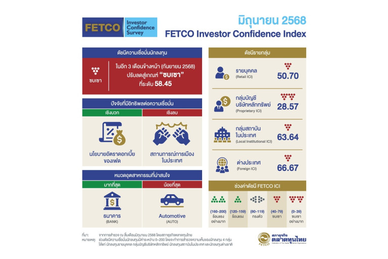 ดัชนีความเชื่อมั่นนักลงทุน (FETCO Investor Confidence Index) สำรวจในเดือนมิถุนายน 2568 ได้ผลสำรวจโดยสรุป ดังนี้