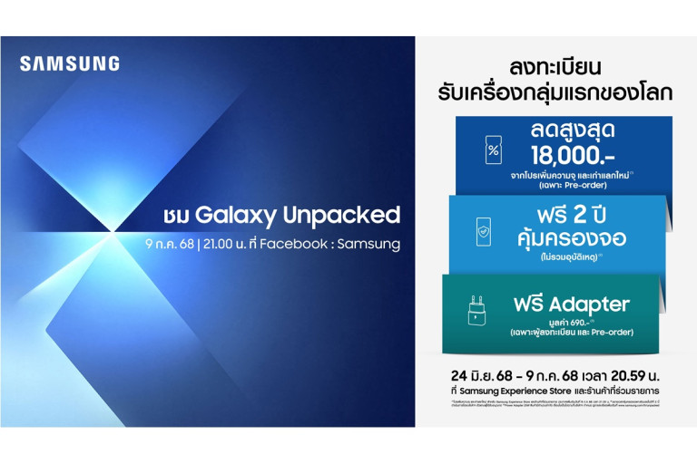 พิเศษ! ลงทะเบียนวันนี้เพื่อรับสิทธิ์ในการเป็นสัมผัส The new Galaxy ก่อนใคร พร้อมโปรฯ ฟรีคุ้มครองจอ 2 ปี ใช้งานอุ่นใจหายห่วง และสิทธิพิเศษสุดคุ้มจากซัมซุง เริ่มลงทะเบียนฟรี ที่ https://bit.ly/PR-release-250624 ตั้งแต่วันนี้ – 9 กรกฎาคม 2568 ที่ Samsung Experience Store และร้านค้าที่ร่วมรายการ