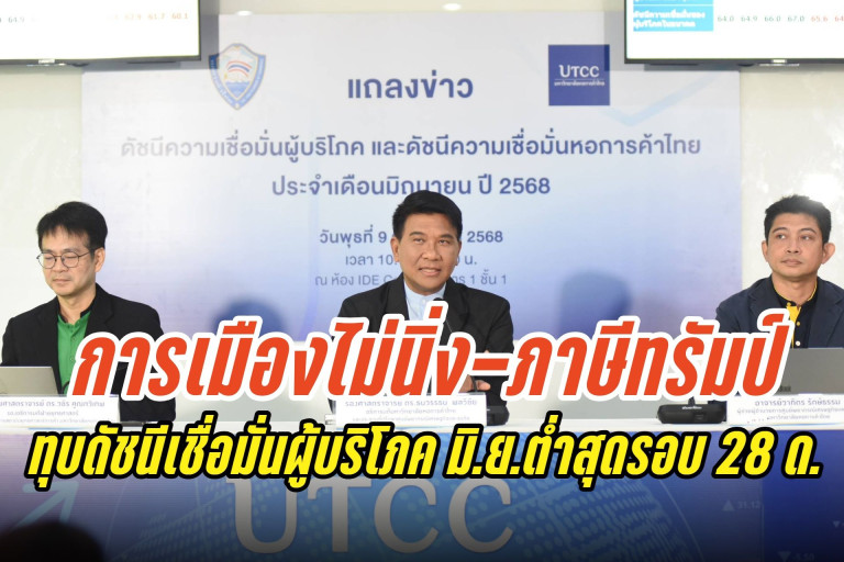 วันที่ 9 ก.ค.68 ศูนย์พยากรณ์เศรษฐกิจและธุรกิจ ม.หอการค้าไทย เปิดเผยว่า จากผลของการสำรวจความเชื่อมั่นของผู้บริโภคในเดือนมิถุนายน 2568 ดัชนีความเชื่อมั่นของผู้บริโภคปรับตัวลดลงทุกรายการต่อเนื่องเป็นเดือนที่ 5 และอยู่ในระดับที่ต่ำสุดในรอบ 28 เดือนนับตั้งแต่เดือนมีนาคม 2566 เป็นต้นมา เนื่องจากผู้บริโภคมีความกังวลเกี่ยวกับเสถียรภาพของรัฐบาลและการเมืองของไทยและสงครามการค้าจากนโยบาย Trump 2.0 และรู้สึกว่าเศรษฐกิจไทยกำลังชะลอตัวอย่างต่อเนื่อง แม้ว่ารัฐบาลจะออกมาตราการกระตุ้นเศรษฐกิจของรัฐบาลและธนาคารแห่งประเทศไทยได้ใช้นโนบายการเงินผ่อนคลายจากการลดอัตราดอกเบี้ยนโยบายตั้งแต่ต้นปีมาแล้ว 2 ครั้งรวม 0.5% อยู่ที่ 1.75% แต่ผู้บริโภครู้สึกว่าเศรษฐกิจไทยยังฟื้นตัวได้ช้าและการเข้าถึงสินเชื่อลำบาก