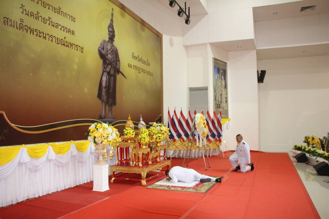 วันที่ 9 ก.ค.68 เวลา 08.00 น. นายชัชวาลย์ เบญจสิริวงศ์ ผู้ว่าราชการจังหวัดร้อยเอ็ด เป็นประธานในพิธีวางพวงมาลาถวายราชสักการะ วันคล้ายวันสวรรคต สมเด็จพระนารายณ์มหาราช ประจำปี 2568 โดยมีหัวหน้าส่วนราชการ ศาล ทหาร ตำรวจ ตลอดจน เหล่ากาชาดร้อยเอ็ด แม่บ้านมหาดไทยจังหวัดร้อยเอ็ด และหน่วยงานที่เกี่ยวข้อง เข้าร่วมพิธี ที่ หอประชุมจังหวัดร้อยเอ็ด อำเภอเมืองร้อยเอ็ด เพื่อน้อมรำลึกถึงพระมหากรุณาธิคุณของพระองค์ท่าน ผู้ทรงพระคุณอันประเสริฐยิ่งและสร้างความเจริญรุ่งเรืองให้แก่ประเทศไทยนานัปการ