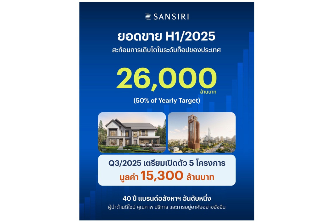 วันที่ 9 ก.ค.68 นายวิชาญ วิริยะภูษิต ประธานผู้บริหารสายงานการเงิน บริษัท แสนสิริ จำกัด (มหาชน) หรือ SIRI บริษัทอสังหาริมทรัพย์ชั้นนำของไทย เปิดเผยว่า "แสนสิริ ยังคงรักษาระดับการเติบโตของยอดขายได้อย่างแข็งแกร่ง ครึ่งปีแรก (สิ้นสุด 30 มิถุนายน 2568) ทำยอดขายได้ 26,000 ล้านบาท (ราว 50% จากเป้าทั้งปีที่ตั้งไว้ 53,000 ล้านบาท) ทะลุเป้าครึ่งปีตามแผนการดำเนินงาน สะท้อนถึงความแข็งแกร่งของแบรนด์และความเชื่อมั่นของผู้บริโภคที่มีต่อแสนสิริ ครึ่งปีหลังพร้อมเดินหน้าเปิดโครงการใหม่อย่างต่อเนื่อง มองภาพรวมอสังหาฯ ยังคงท้าทาย ทั้งภาวะเศรษฐกิจในประเทศ สถานการณ์ทางการเมือง ปัญหาความขัดแย้งจากภูมิรัฐศาสตร์ที่อาจกระทบต่อการบริโภคและการลงทุนภาคเอกชน อย่างไรก็ตาม ยังคงมีปัจจัยบวกจากแนวโน้มดอกเบี้ยขาลง ผ่อนคลายมาตรการ LTV ให้กู้ได้เต็ม 100% ในทุกระดับราคา และ