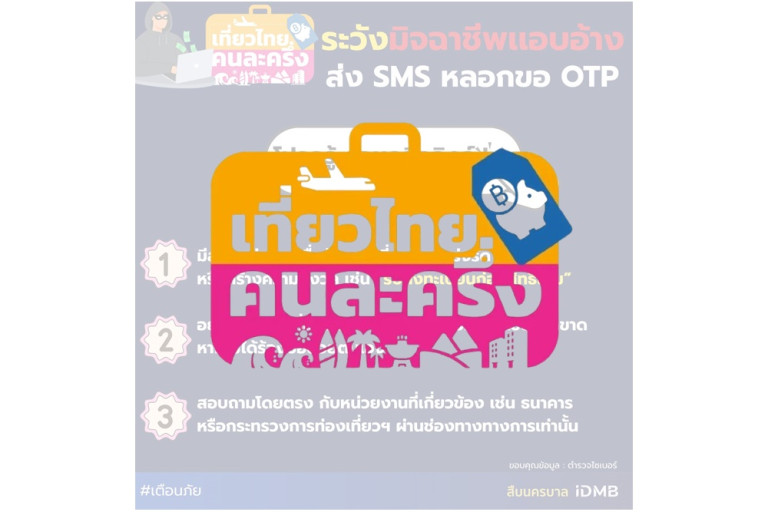 ในช่วงที่มีโครงการส่งเสริมการท่องเที่ยวของรัฐอย่าง “เที่ยวไทยคนละครึ่ง 2568” เปิดให้ลงทะเบียน มิจฉาชีพมักอาศัยจังหวะนี้ส่ง SMS แอบอ้างหลอกลวง เพื่อขอรหัส OTP หรือหลอกให้คลิกลิงก์กรอกข้อมูลส่วนตัวได้