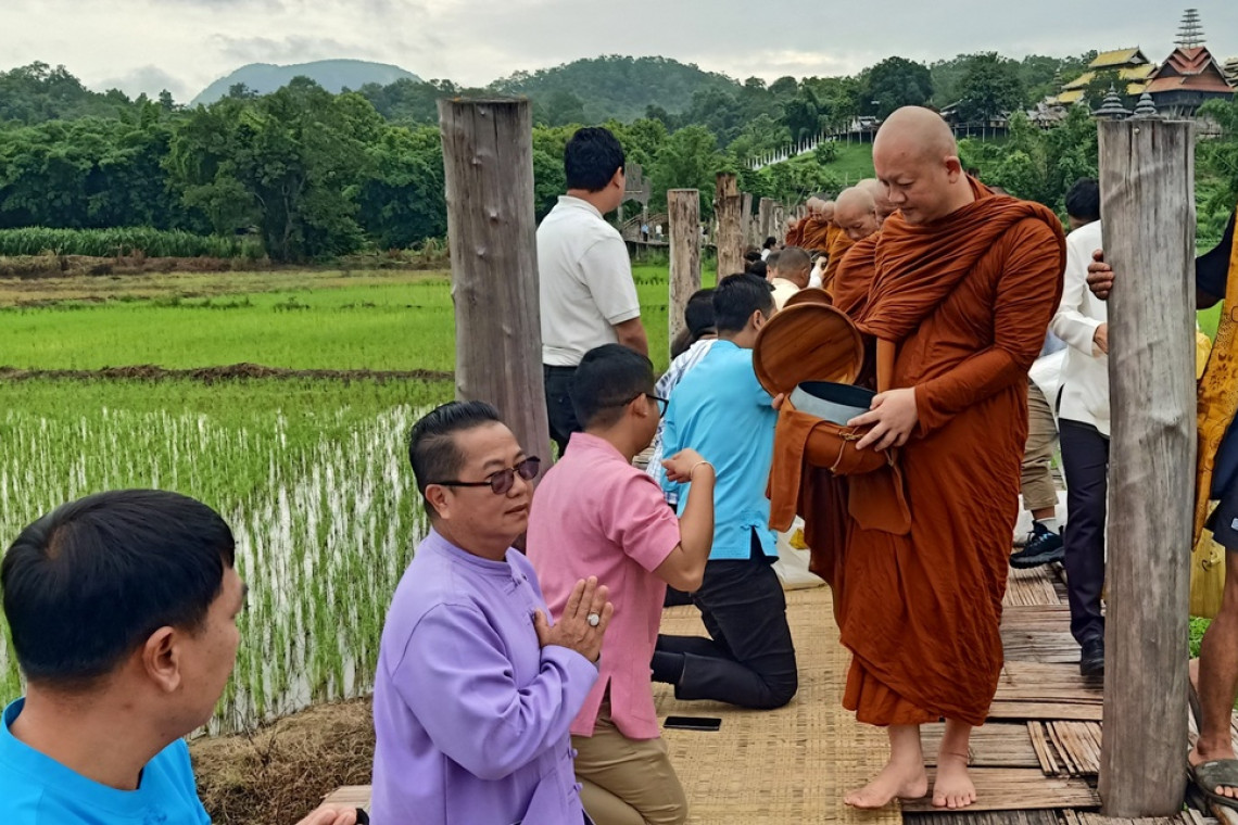 เมื่อเวลา 07.30 น. วันที่ 11 ก.ค.68 นายเอกวิทย์ มีเพียร ผวจ.แม่ฮ่องสอนพร้อมด้วยส่วนราชการพุทธศาสนิกชนชาว อ.เมืองแม่ฮ่องสอน จ.แม่ฮ่องสอน ได้ร่วมกันทำบุญตักบาตรข้าวสาร –อาหารแห้งพระภิกษุสงฆ์-สามเณรจำนวน 65 รูป นำโดยพระปลัดจิตพัฒน์ อคคปัญโญ เจ้าอาวาสวัดภูสมะณาราม ที่รับบิณฑบาตไปตามสะพานซูตองเป้หรือสะพานบุญอธิฐานแห่งความสำเร็จ ซึ่งเป็นสะพานไม้ไผ่ทอดข้ามทุ่งนาจากวัดภูสมะณารามไปยังหมู่บ้านกุงไม้สัก ต.ปางหมู อ.เมืองแม่ฮ่องสอนระยะทางราว 600 เมตร เนื่องในเทศกาลวันเข้าพรรษา ท่ามกลางอากาศที่เย็นสะบาย ปราศจากสายฝนที่เคยตกลงมาเช่นทุกวัน