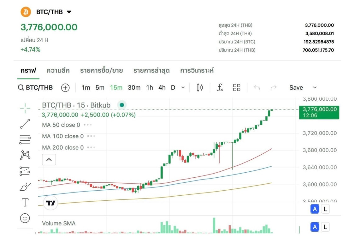 เมื่อวันที่ 11 ก.ค.68 เหรียญบิตคอยน์ (BTC) สร้างสถิติราคาสูงสุดตลอดกาลครั้งใหม่ (All Time High) ด้วยราคา 1 BTC = 116,608.78 ดอลลาร์สหรัฐ ซึ่งเป็นระดับสูงสุดใหม่จากระดับสูงสุดเดิมที่เคยทำไว้ที่เมื่อวันที่ 22 พ.ค. 68 ตามข้อมูลจากเว็บไซต์ coinmarketcap.com ส่วนบนกระดานไทย บิทคับ เอ็กซ์เชนจ์ ราคาล่าสุด ณ วันที่ 11 ก.ค. 68 BTC อยู่ที่ 3,776,000.00 บาท โดยราคา Bitcoin (BTC) ใน 24 ชั่วโมงมีการปรับตัวเพิ่มขึ้น 4.14% มีราคาสูงสุดอยู่ที่ 3,776,000.00 บาท และมีราคาต่ำสุด ที่ 3,580,008.01 บาท อ้างอิงราคา BTC จาก https://www.bitkub.com/th/market/btc