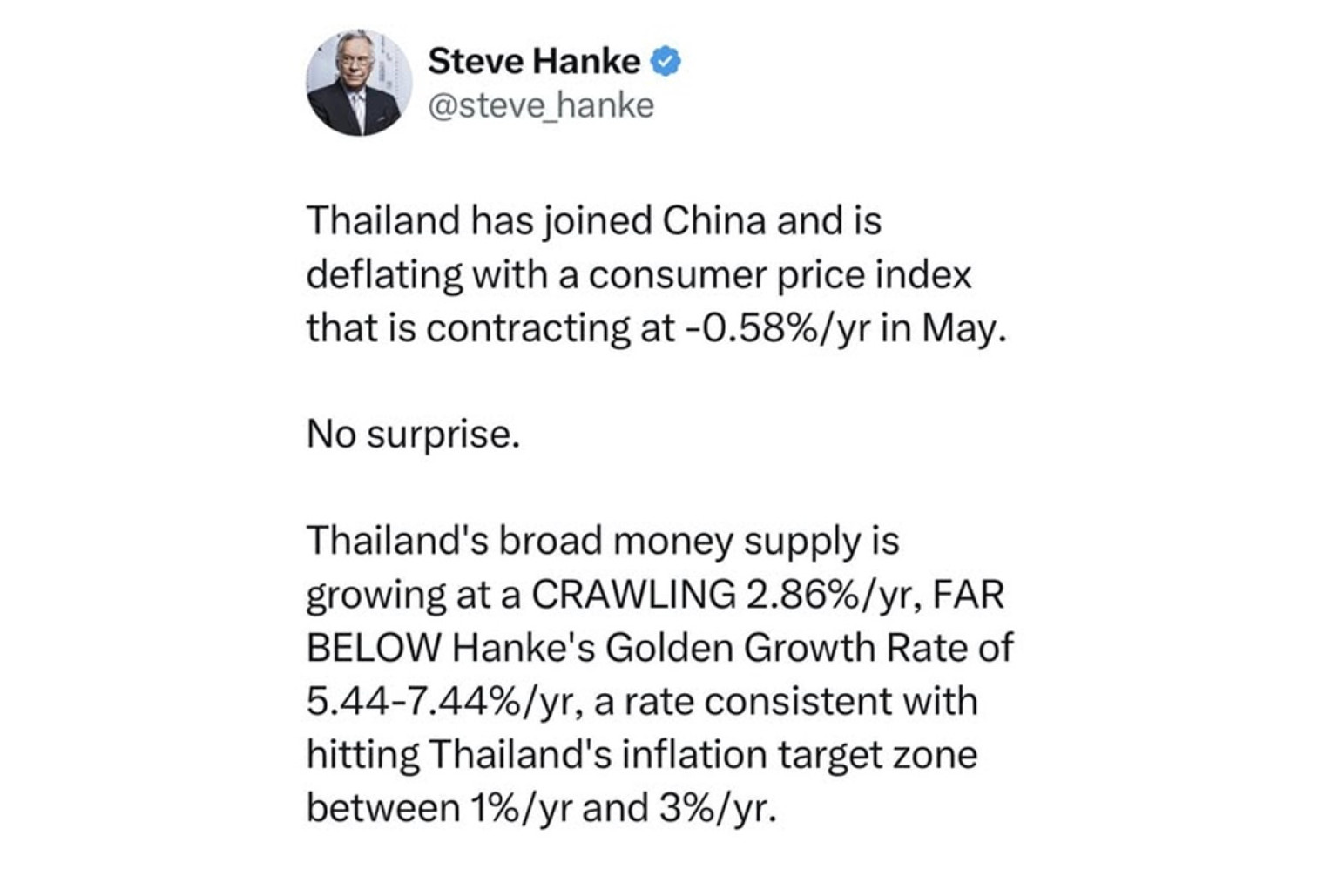 ผมอ้างอิงข้อมูลของ ส.สตีฟ แฮงคี้ ซึ่งสอนอยู่ที่ ม.จอห์น ฮอบกิ้นส์ ในสหรัฐ ซึ่งคำนวณว่า ธปท. เพิ่มปริมาณเงินในอัตราต่ำเพียง 2.86% ต่อปีเท่านั้น จึงทำให้เศรษฐกิจไทยขยายตัวต่ำไป และอัตราเงินเฟ้อที่เกิดขึ้นจริง จึงขยับขึ้นแทบไม่ถึงกรอบขั้นต่ำ คือ 1% ต่อปี