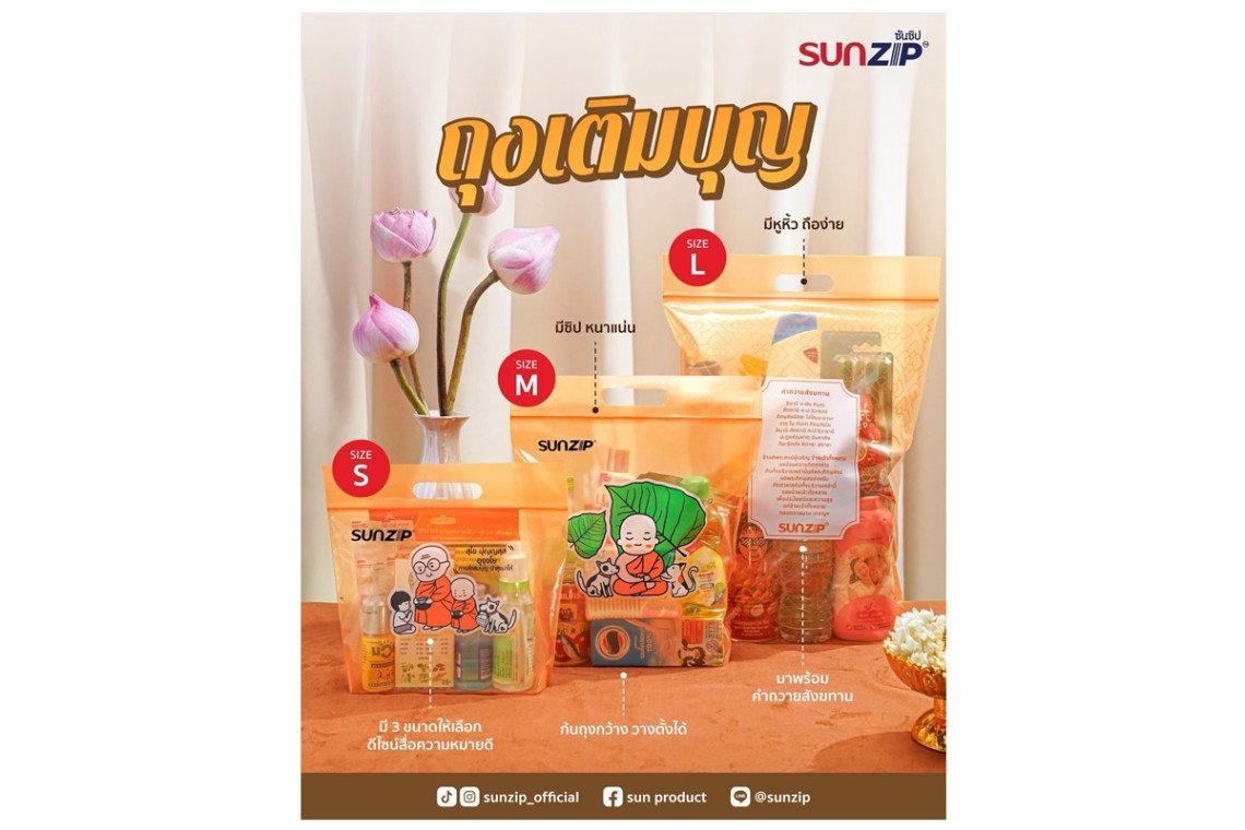 บมจ.ทานตะวันอุตสาหกรรม หรือ THIP ผู้ผลิตและจำหน่ายบรรจุภัณฑ์แบบครบวงจร ส่งผลิตภัณฑ์ “ถุงเติมบุญ” ภายใต้แบรนด์ SUNZIP ต้อนรับเทศกาลเข้าพรรษา ตอบโจทย์ผู้บริโภคที่ต้องการจัดชุดของทำบุญด้วยตนเองอย่างมีสไตล์และสะดวกสบาย พร้อมยกระดับภาพลักษณ์การทำบุญให้ดูร่วมสมัยมากยิ่งขึ้น