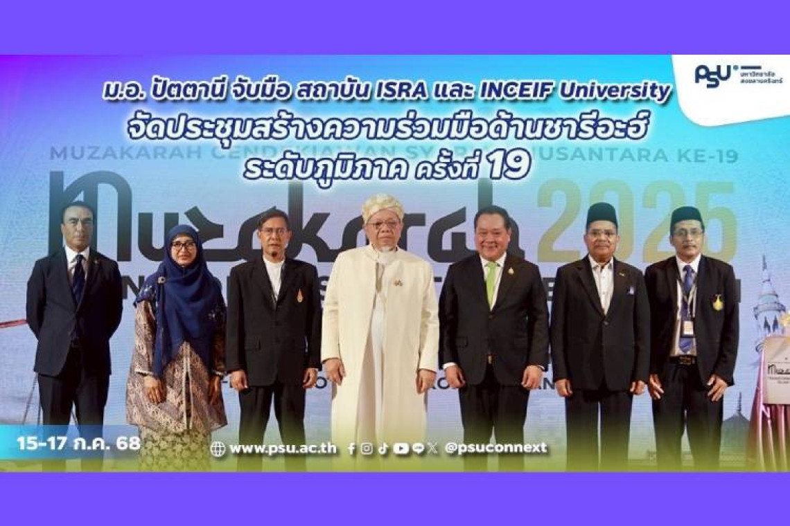 ศูนย์เศรษฐศาสตร์และการเงินอิสลาม คณะวิทยาการอิสลาม มหาวิทยาลัยสงขลานครินทร์ วิทยาเขตปัตตานี ร่วมกับ สถาบัน ISRA และ INCEIF University ประเทศมาเลเซีย จัดการประชุม Muzakarah Cendekiawan Syariah Nusantara ครั้งที่ 19 ภายใต้หัวข้อ “การปฏิรูประบบการเงินอิสลามแบบบูรณาการ” เพื่อเสริมสร้างความร่วมมือด้านชารีอะฮ์ระดับภูมิภาค โดยได้รับเกียรติจาก พ.ต.อ. ทวี สอดส่อง รัฐมนตรีว่าการกระทรวงยุติธรรม เป็นประธานในพิธีเปิด พร้อมด้วย นายอรุณ บุญชม จุฬาราชมนตรีแห่งประเทศไทย ผศ. ดร.มูหัมมัดรอฟลี แวหะมะ คณบดีคณะวิทยาการอิสลาม มหาวิทยาลัยสงขลานครินทร์ Dr. Marjan Muhammad รองอธิการบดีฝ่ายวิจัย INCEIF University และมีผู้เข้าร่วมงานกว่า 200 คน ณ โรงแรมอัล มีรอซ กรุงเทพมหานคร ระหว่างวันที่ 15 - 17 กรกฎาคม 2568