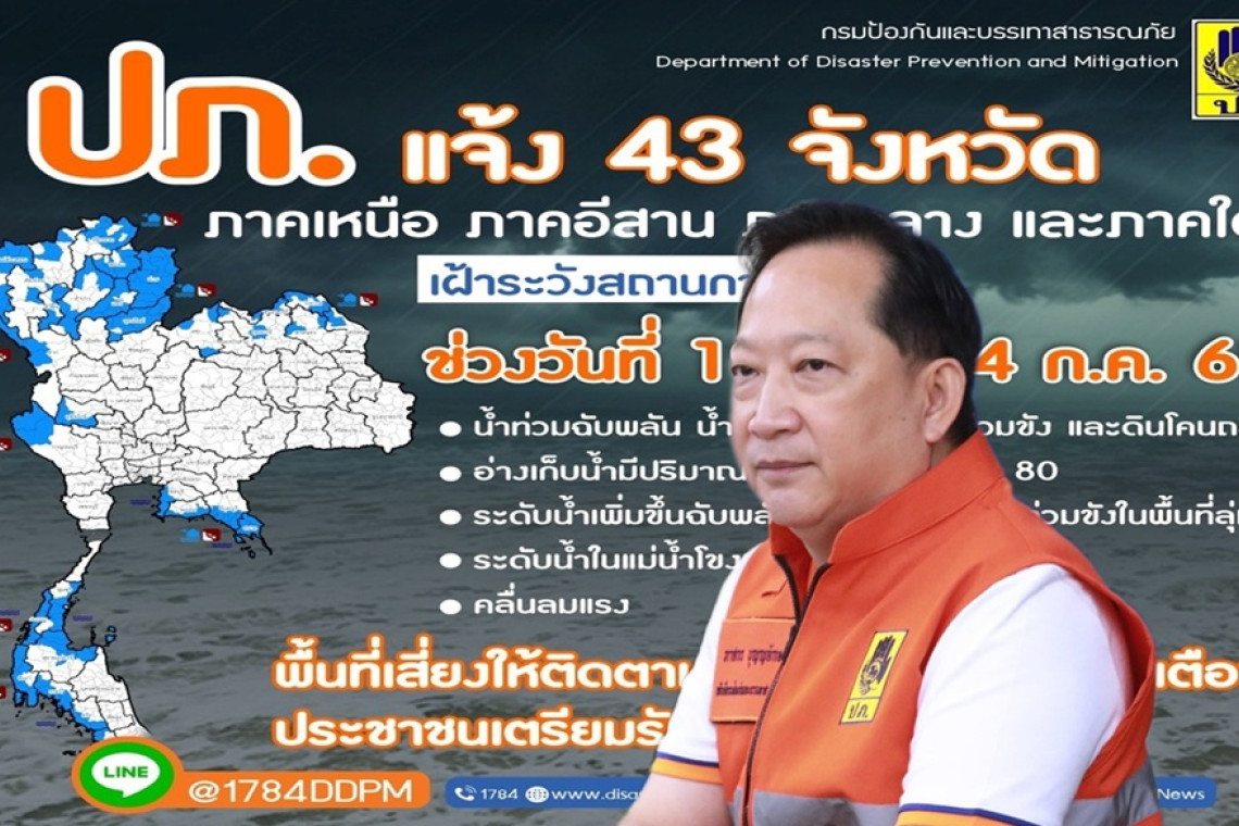 ปภ. แจ้ง 43 จังหวัด ในพื้นที่ภาคเหนือ ภาคตะวันออกเฉียงเหนือ ภาคกลาง และภาคใต้ เฝ้าระวังสถานการณ์น้ำท่วมฉับพลัน น้ำป่าไหลหลาก ดินโคลนถล่ม คลื่นลมแรง ช่วงวันที่ 19-24 ก.ค. 68