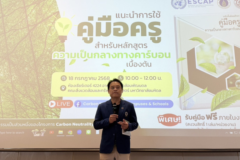 มหาวิทยาลัยมหิดลในฐานะผู้ร่วมก่อตั้ง “เครือข่ายมหาวิทยาลัยยั่งยืนแห่งประเทศไทย” ได้ขับเคลื่อนแนวคิดความเป็นกลางทางคาร์บอนอย่างต่อเนื่องผ่านโครงการ Carbon Neutrality Campus (CNC) ซึ่งริเริ่มโดยคณะสิ่งแวดล้อมฯ ด้วยทุนสนับสนุนความร่วมมือระหว่างประเทศ (Joint Unit) มหาวิทยาลัยมหิดล และได้รับความร่วมมือจากองค์กรระดับนานาชาติ ได้แก่ UNESCAP และ Shanghai Jiao Tong University โดยปัจจุบันมีเครือข่ายร่วมมือจากกว่า 10 ประเทศในภูมิภาคเอเชีย ล่าสุด โครงการ CNC ได้ขยายผลลงสู่ระดับโรงเรียน ด้วยความเชื่อมั่นว่าเยาวชนคือพลังสำคัญในการขับเคลื่อนสังคมในระยะยาว และการเรียนรู้เกี่ยวกับการเปลี่ยนแปลงสภาพภูมิอากาศและความเป็นกลางทางคาร์บอน ควรเริ่มตั้งแต่วัยเรียน โดย “คู่มือครูความเป็นกลางทางคาร์บอน” ถือเป็นเครื่องมือสำคัญในการส่งเสริมกระบวนการเรียนการสอนด้านนี้อย่างเป็นระบบและเข้าใจง่าย