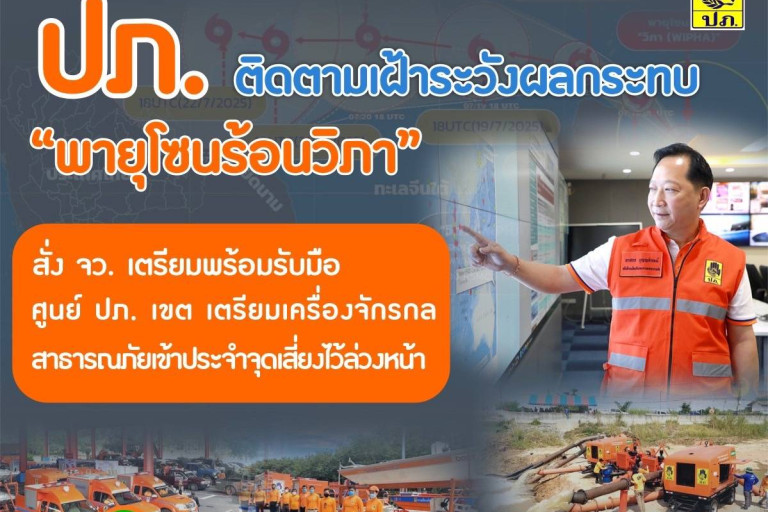 ปภ. ติดตามเฝ้าระวังพายุโซนร้อน “วิภา” ประสานจังหวัดในพื้นที่เสี่ยงภัยเตรียมพร้อมรับมือ 24 ชั่วโมง สั่งการศูนย์ ปภ.เขต นำเครื่องจักรกลเข้าประจำจุดเสี่ยงไว้ล่วงหน้า เตรียมเปิด War room ประชุมประเมินสถานการณ์ 20 ก.ค. 68 นี้