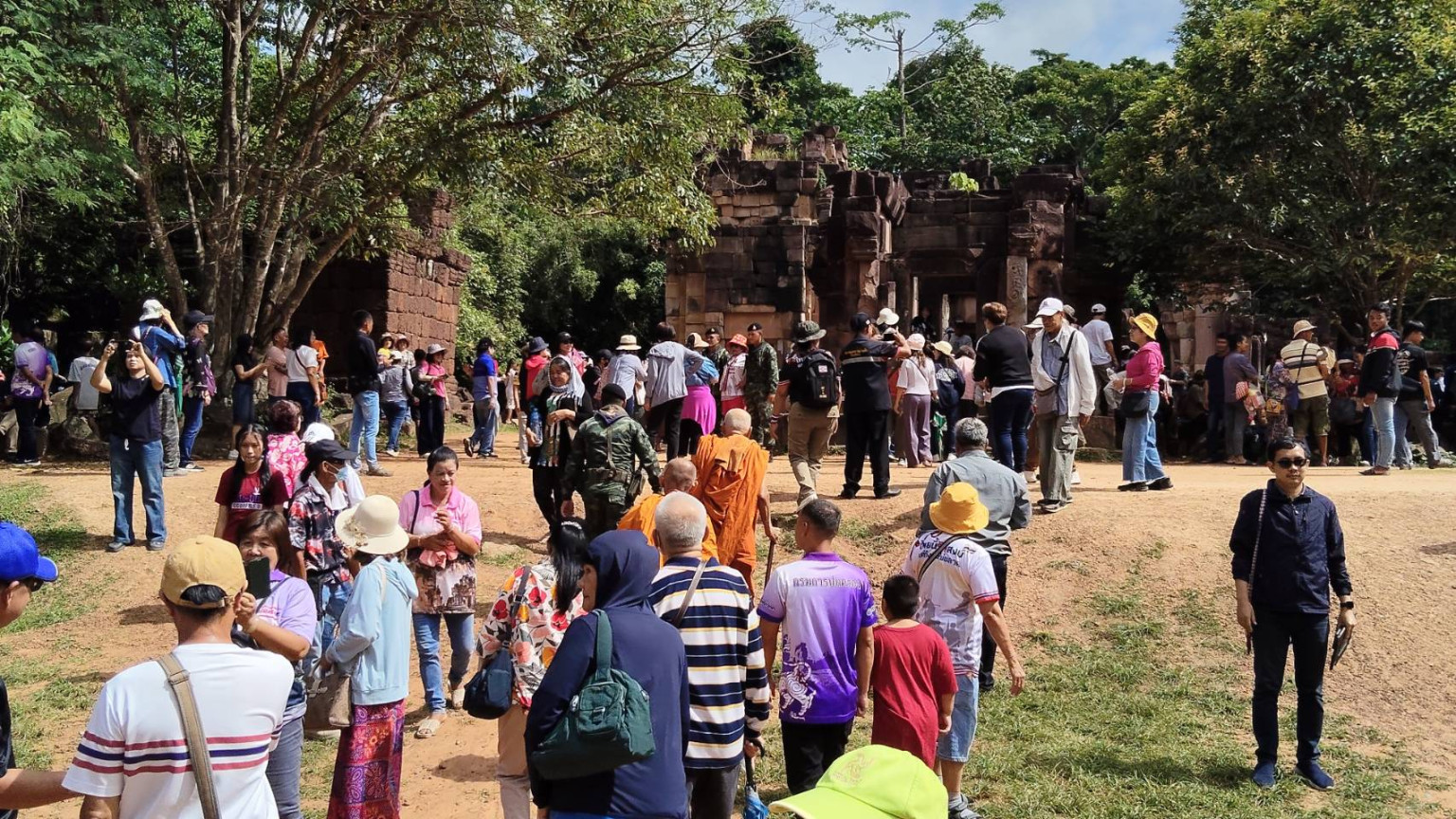 วันที่ 20 ก.ค.68 ผู้สื่อข่าวรายงานถึงบรรยากาศที่ปราสาทตาเมือนธม ต.ตาเมียง อ.พนมดงรัก จ.สุรินทร์ ตั้งแต่เข้า ก่อนเวลา เปิด 9 โมง พบคณะคนไทยรักชาติ จ.จันบุรี ที่เดินทางโดยรถทัวร์ 4 คันรถตู้อีก 5 คัน มาแสดงพลังมอบสิ่งของให้กำลังใจทหาร จอดรถรอเวลาที่ถนนทางเข้าหน้าฐานทหารด่านแรก ก่อนพากันลงมารอเวลาเปิดเพลงร้อง เต้นรำ ชูป้ายกันอย่างสนุกสนาน ขณะที่คนไทยจากหลายจังหวัดเริ่มขับรถยนต์ส่วนตัวทยอยเดินทางเข้ามาอย่างต่อเนื่อง