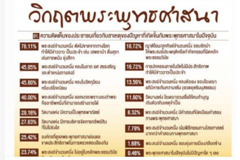 ร้อยละ 40.00 ระบุว่า พระสงฆ์จำนวนหนึ่ง ออกบวชเพราะมองว่าพระคืออาชีพหนึ่งที่สามารถสร้างรายได้ ร้อยละ 29.16 ระบุว่า วัดบางแห่ง มีความเป็นพุทธพาณิชย์ ร้อยละ 27.63 ระบุว่า วัดบางแห่ง มีการบริหารจัดการทรัพย์สิน ที่ไม่โปร่งใส ร้อยละ 25.42 ระบุว่า องค์กรที่ดูแลพระพุทธศาสนาอ่อนแอขาดประสิทธิภาพในการตรวจสอบป้องกัน ร้อยละ 23.74 ระบุว่า พระสงฆ์จำนวนหนึ่ง ไม่อยู่ในหลักพระธรรมวินัยมีพฤติกรรมก้าวร้าว ร้อยละ 16.72 ระบุว่า ญาติโยม/ลูกศิษย์จำนวนหนึ่ง ชอบชักนำให้พระสงฆ์ประพฤติหรือทำกิจกรรมที่ผิดหลักพระธรรมวินัยและการปกครองภายในวัดไม่มีประสิทธิภาพทำให้มีข่าวฉาวเป็นประจำ