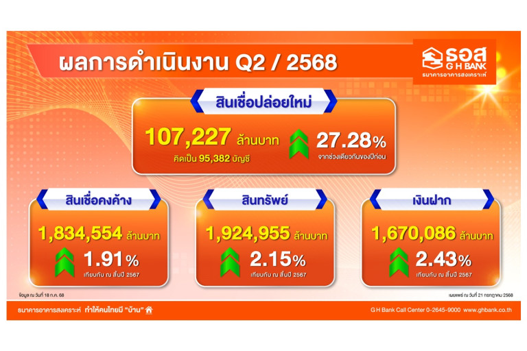 อย่างต่อเนื่อง โดยครึ่งปีแรกของปี 2568 สามารถปล่อยสินเชื่อใหม่ได้ทั้งสิ้น 107,227 ล้านบาท คิดเป็นจำนวนลูกค้า 95,382 บัญชี เพิ่มขึ้นจากช่วงเดียวกันของปีก่อน 27.28% ส่งผลให้เมื่อเทียบกับ ณ สิ้นปี 2567 ธอส. มียอดสินเชื่อคงค้างรวมทั้งสิ้น 1,834,554 ล้านบาท เพิ่มขึ้น 1.91% สินทรัพย์รวม 1,924,955 ล้านบาท เพิ่มขึ้น 2.15% เงินฝากรวม 1,670,086 ล้านบาท เพิ่มขึ้น 2.43% สะท้อนศักยภาพการขับเคลื่อนตลาดที่อยู่อาศัยที่มีคุณภาพให้กับคนไทยและมีส่วนในการกระตุ้นเศรษฐกิจผ่านภาคอสังหาริมทรัพย์ให้ขยายตัวได้ดีขึ้น ซึ่งเป็นผลมาจากการจัดทำมาตรการตามนโยบายนายพิชัย ชุณหวชิร รองนายกรัฐมนตรีและรัฐมนตรีว่าการกระทรวงการคลัง ในการปล่อยสินเชื่อให้กับลูกค้าทุกกลุ่ม ทั้งผู้มีรายได้น้อยและปานกลาง ลูกค้ากลุ่มเปราะบาง เพื่อให้ผู้ที่ขาดโอกาสได้เข้าถึงสินเชื่อมากขึ้น รวมถึงกลุ่มผู้ที่มีกำลังซื้อที่อยู่อาศัยระดับราคามากกว่า 7 ล้านบาท
