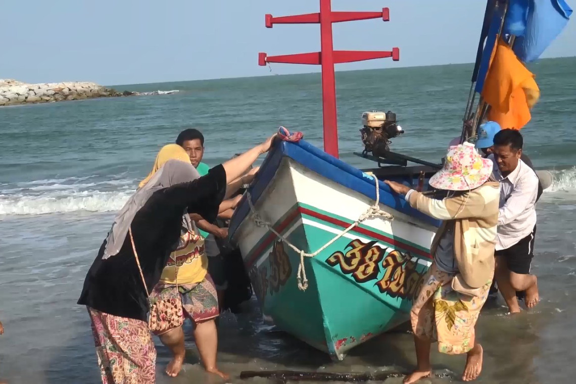 ในวันนี้ อ่าวไทยตอนล่างห่างฝั่งมีคลื่นสูง 2 เมตร ชาวประมงพื้นบ้านออกเรือไปตั้งแต่ตีสี่ตีห้ากลับเข้าฝั่งช่วง 9 โมงสามารถวางอวนจับกุ้งหางแดงตัวใหญ่ที่มีราคาแพงได้หลายกิโลกรัม ส่งขายราคากิโลกรัมละ500-600 บาท และมีปลาบางส่วนหลากหลายชนิด โดยจะให้ทางแม่บ้านนำไปส่งขายให้กับแม่ค้าขาประจำที่มารับซื้อในหมู่บ้านส่งขายให้กับแพปลา นำรายได้เลี้ยงครอบครัว