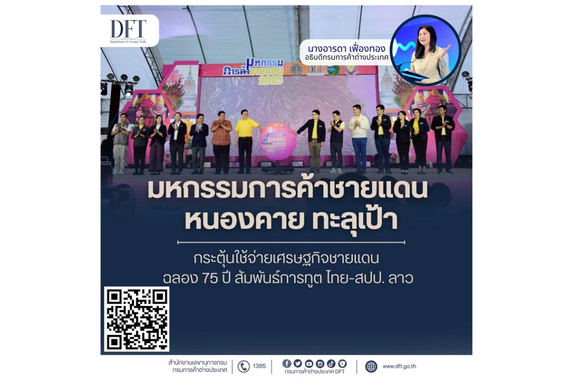 กรมการค้าต่างประเทศ ปิดฉากงาน “มหกรรมการค้าชายแดน ณ จังหวัดหนองคาย” ระหว่างวันที่ 3-8 กรกฎาคม 2568 อย่างสวยงาม สร้างยอดขายเกินคาดกว่า 91 ล้านบาท กระตุ้นการใช้จ่ายและเศรษฐกิจชายแดน ดันสินค้า SMEs/ท้องถิ่นก้าวสู่ตลาดต่างประเทศ พร้อมนำผู้ประกอบการ สปป.ลาว ร่วมออกบูธ หนุนการค้าไทย-สปป.ลาว ขยายตัว ฉลองครบรอบ 75 ปี ความสัมพันธ์ทางการทูต ไทย–สปป.ลาว