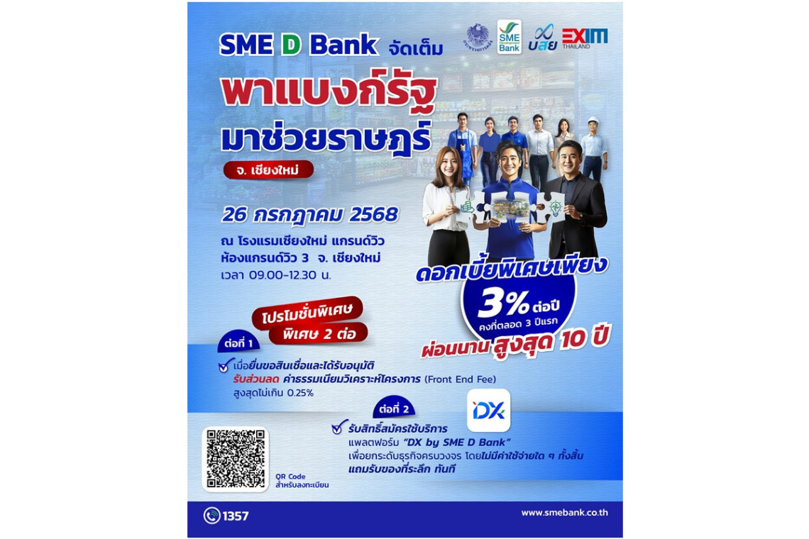 ธนาคารพัฒนาวิสาหกิจขนาดกลางและขนาดย่อมแห่งประเทศไทย (ธพว.) หรือ SME D Bank ขับเคลื่อนนโยบายรัฐ เดินหน้าช่วยกระตุ้นเศรษฐกิจ ขึ้นเหนือจังหวัดเชียงใหม่ ร่วมทัพงาน “พาแบงก์รัฐ มาช่วยราษฎร์” สนับสนุนผู้ประกอบการเอสเอ็มอีพื้นที่ภาคเหนือ เข้าถึงบริการ “พัฒนาคู่เติมทุน” ในวันที่ 26 กรกฎาคม 2568 เวลา 09.00-12.30 น. ณ โรงแรมเชียงใหม่ แกรนด์วิว ห้องแกรนด์วิว 3 จ.เชียงใหม่ ภายในงานพบกับสินเชื่ออัตราดอกเบี้ยพิเศษเพียง 3% ต่อปี คงที่ตลอด 3 ปีแรก ผ่อนชำระนานสูงสุด 10 ปี ครอบคลุมทุกกลุ่มธุรกิจและทุกความต้องการของเอสเอ็มอี พร้อมทีมให้คำปรึกษาเตรียมพร้อมเข้าถึงแหล่งทุน ยื่นกู้ได้ทันทีภายในงาน