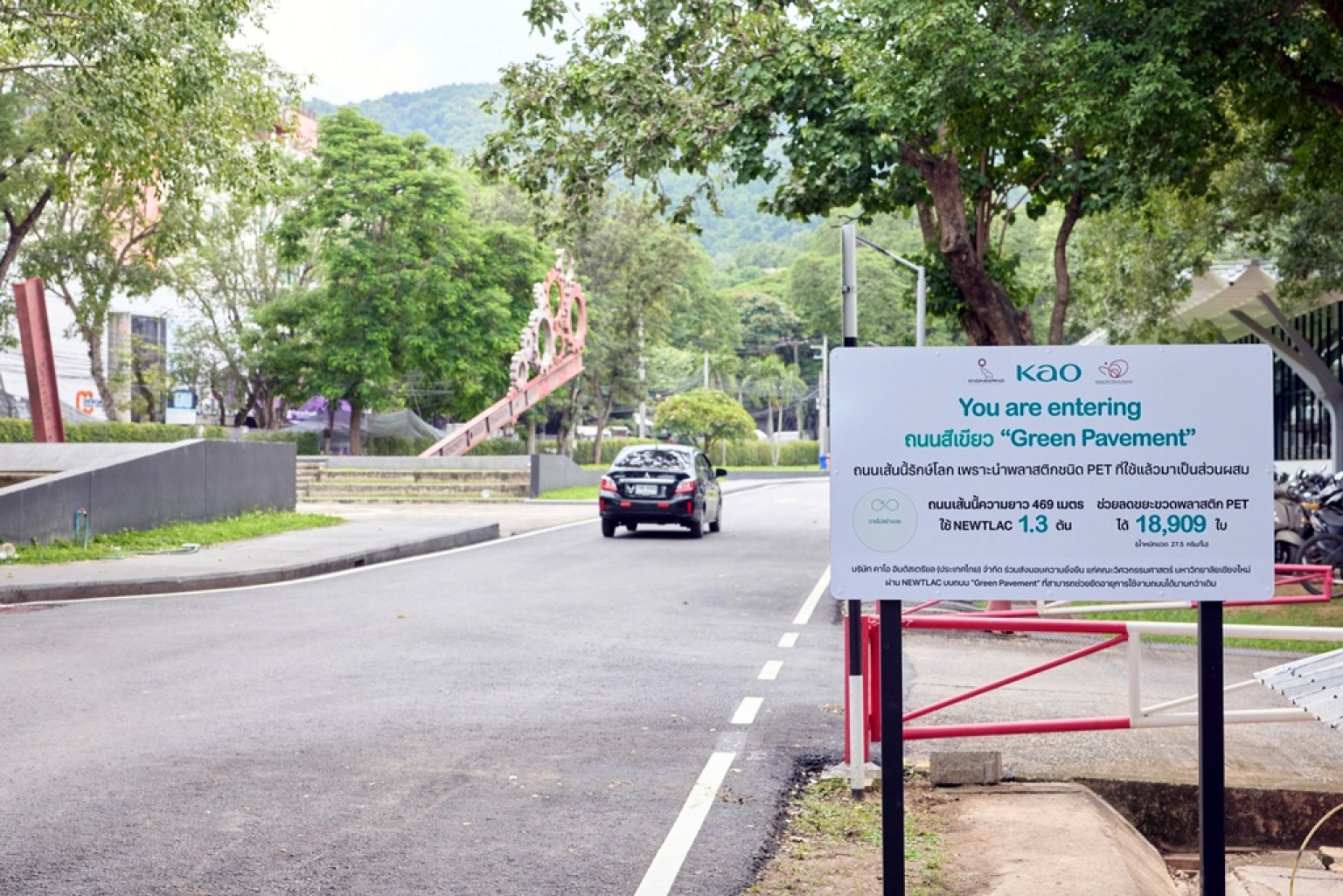 โครงการถนนสีเขียว “Green Pavement” มีส่วนหนึ่งเป็นต้นแบบถนนยางมะตอยแบบซึมน้ำ (Porous Asphalt) ที่ผสานเทคโนโลยี NEWTLAC 5510 ของคาโอ ซึ่งพัฒนาจากการนำขวดพลาสติก PET ที่ใช้แล้ว มาผ่านกระบวนการทางเคมีจนได้ผงละเอียดสีเหลืองคล้ายน้ำตาลทราย จากนั้นนำไปผสมกับยางมะตอยปกติ ผลลัพธ์ที่ได้คือยางมะตอยชนิดพิเศษที่มีคุณสมบัติโดดเด่นทั้งด้านความแข็งแรง ความทนทานกว่าเดิม ทนการกัดเซาะน้ำได้ดี และยืดอายุการใช้งานที่ยาวนานกว่าเดิม โดยคาโอได้สนับสนุนงบประมาณและวัสดุมูลค่ารวม 1,230,000 บาท สำหรับปรับปรุงถนนภายในมหาวิทยาลัยเชียงใหม่ ระยะทาง 469 เมตร เป็นพื้นที่กว่า 3,000 ตารางเมตร โดยใช้ NEWTLAC 1.3 ตัน ซึ่งสามารถรีไซเคิลขวดพลาสติก PET ได้ถึง 18,909 ใบ ทำให้ถนนเส้นนี้รักษ์โลก และยังมีคุณสมบัติโดดเด่นเรื่องความแข็งแรง ทนทาน ดูดซับน้ำได้ดี อีกทั้งยังรักษาระบบนิเวศเดิมของมหาวิทยาลัย
