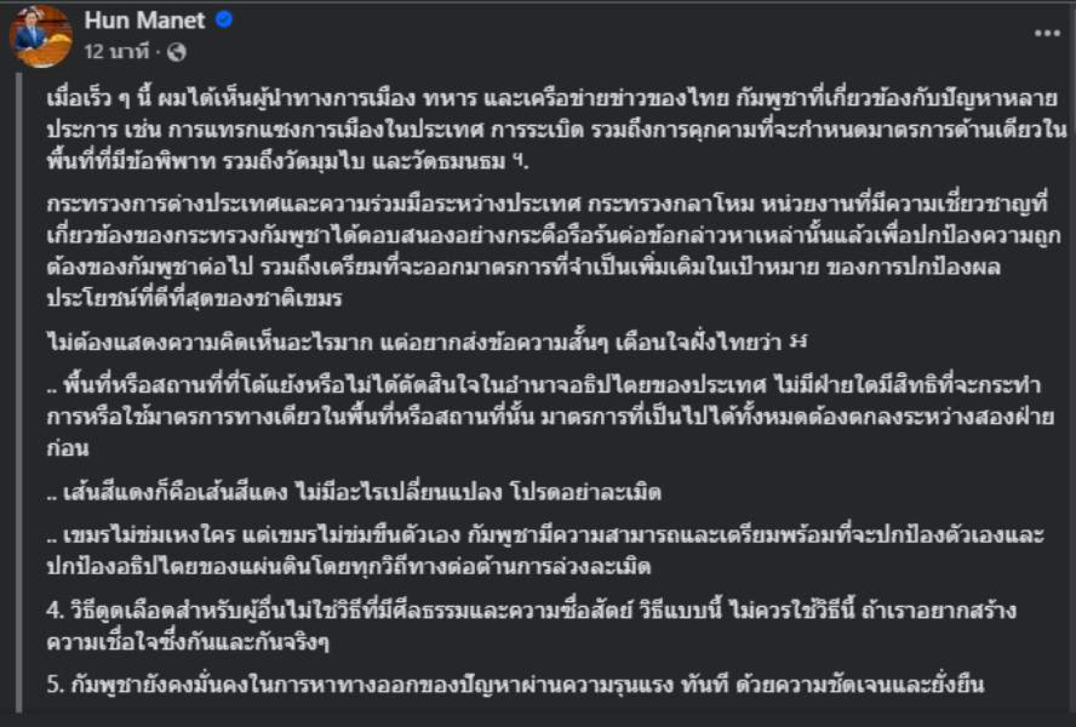 วันที่ 22 ก.ค.68 ฮุน มาเนต นายกรัฐมนตรีกัมพูชา โพสต์ข้อความผ่านเฟซบุ๊ก Hun Manet ระบุว่า...