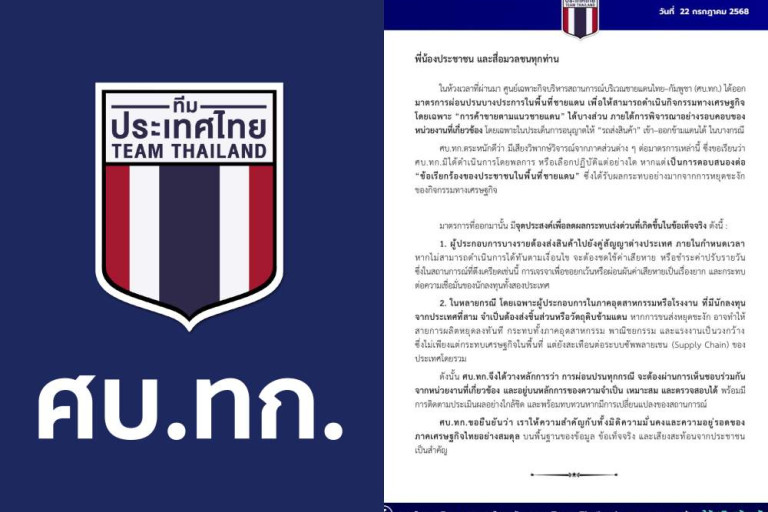 ในห้วงเวลาที่ผ่านมา ศูนย์เฉพาะกิจบริหารสถานการณ์บริเวณชายแดนไทย–กัมพูชา (ศบ.ทก.) ได้ออกมาตรการผ่อนปรนบางประการในพื้นที่ชายแดน เพื่อให้สามารถดำเนินกิจกรรมทางเศรษฐกิจ โดยเฉพาะ “การค้าขายตามแนวชายแดน” ได้บางส่วน ภายใต้การพิจารณาอย่างรอบคอบของหน่วยงานที่เกี่ยวข้อง โดยเฉพาะในประเด็นการอนุญาตให้ “รถส่งสินค้า” เข้า–ออกข้ามแดนได้ ในบางกรณี