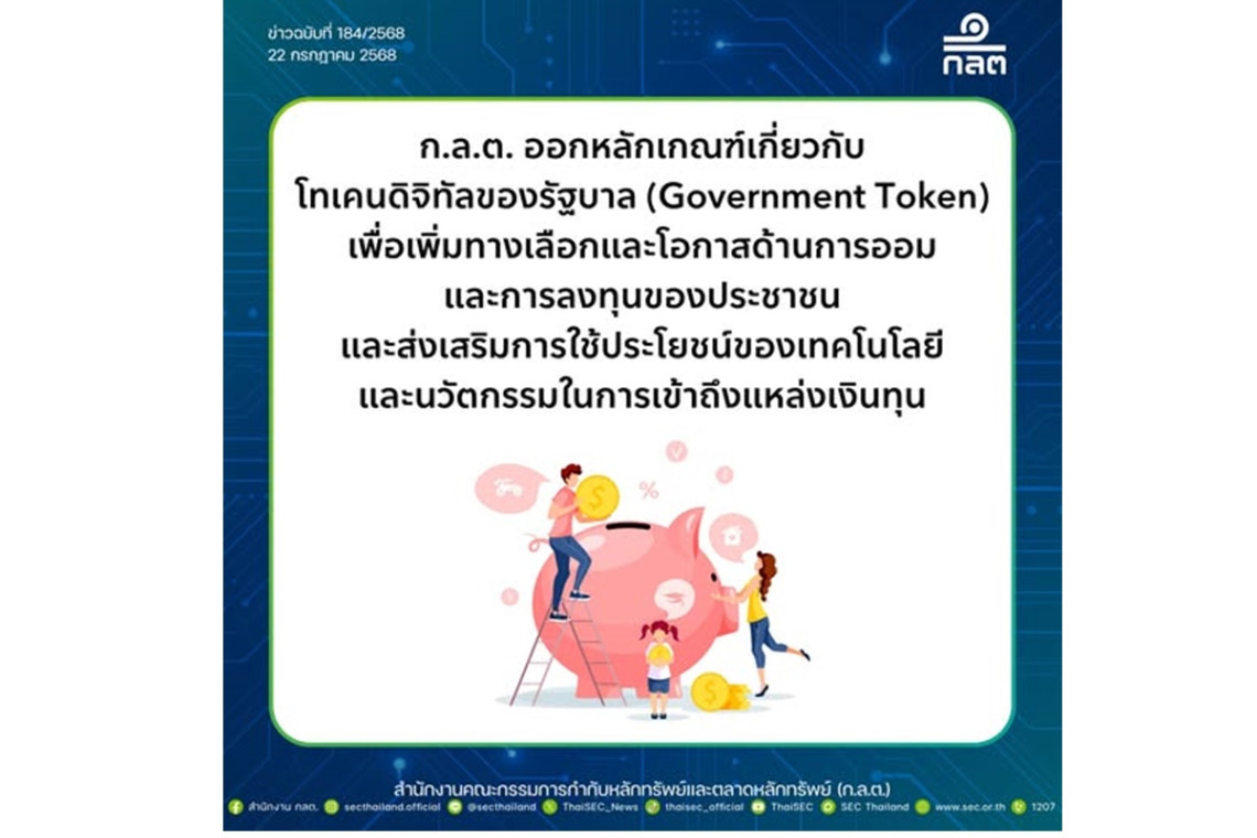 วันที่ 22 ก.ค.68 สำนักงานคณะกรรมการกำกับหลักทรัพย์และตลาดหลักทรัพย์ (ก.ล.ต.) ออกหลักเกณฑ์เกี่ยวกับโทเคนดิจิทัลของรัฐบาล (Government Token : G-Token) เพื่อสนับสนุนการเพิ่มทางเลือกและโอกาสด้านการออมและการลงทุนของประชาชนอย่างทั่วถึง (financial inclusion) รวมถึงการนำประโยชน์จากเทคโนโลยีและนวัตกรรมมาใช้เพิ่มประสิทธิภาพในการระดมทุน โดยมีการกำกับดูแลที่เหมาะสมและเกิดความเท่าเทียมกันในการแข่งขัน และมีกลไกในการดูแลผู้ลงทุนอย่างเพียงพอ โดยมีผลใช้บังคับตั้งแต่วันที่ 21 กรกฎาคม 2568