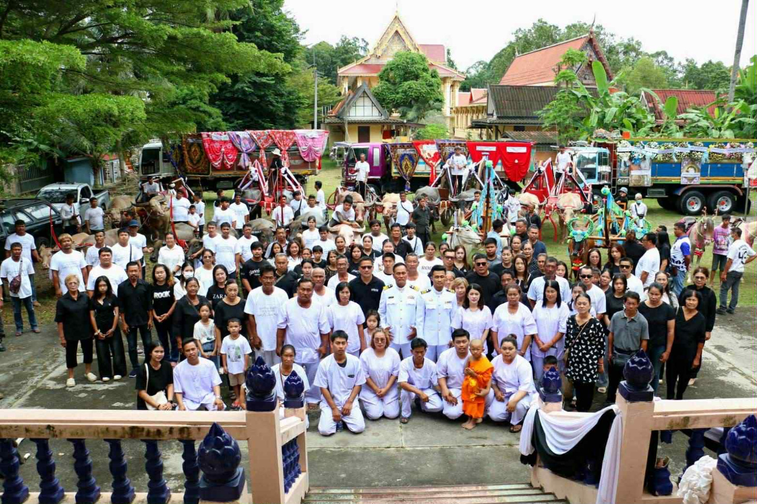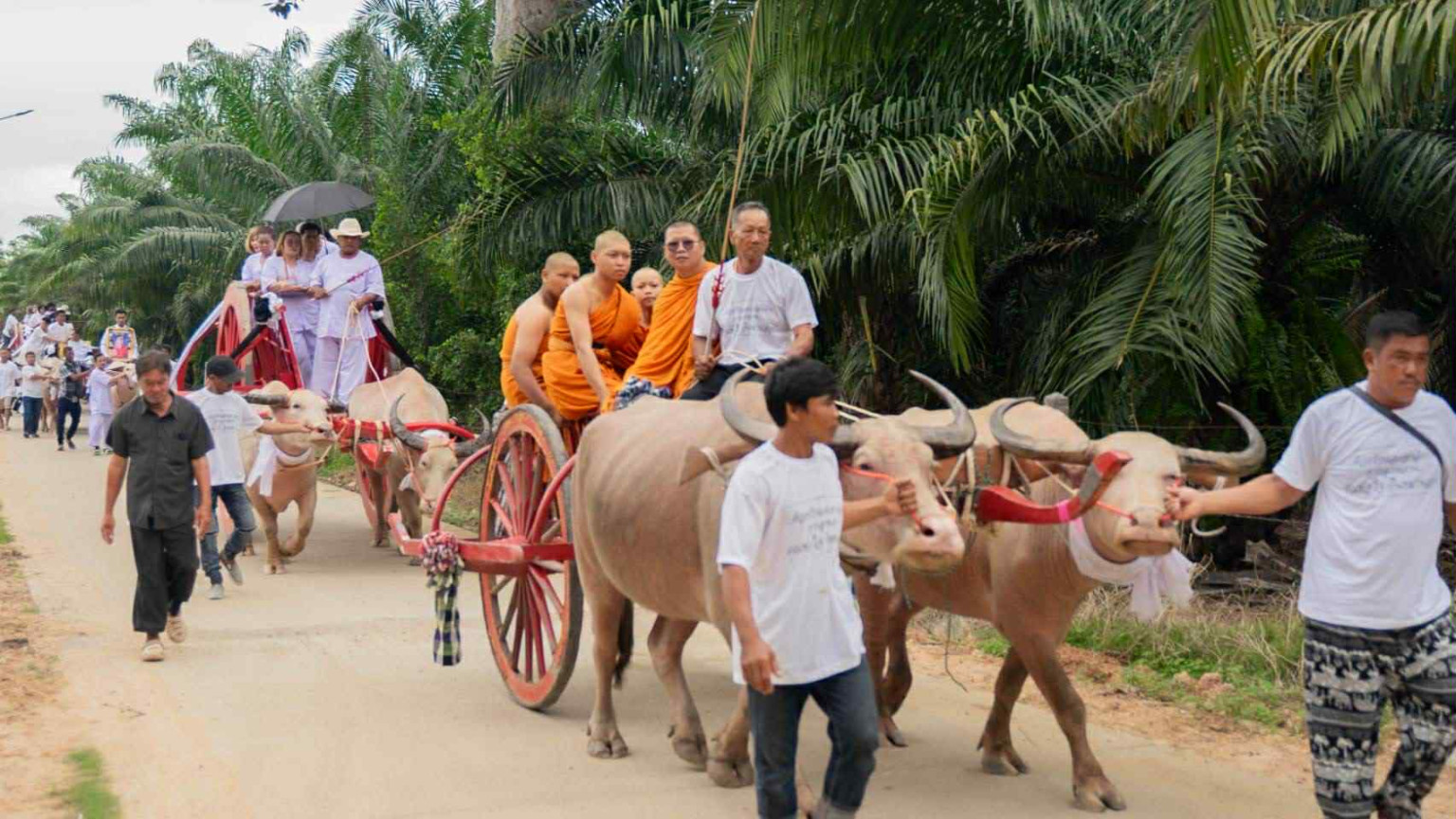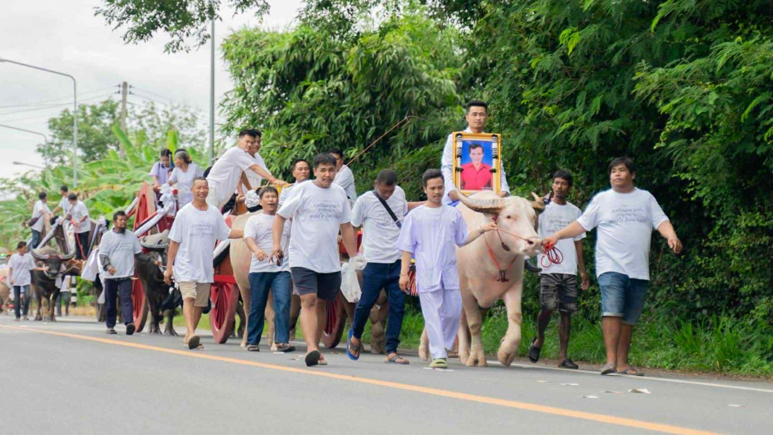 ภาพบรรยากาศขบวนเคลื่อนย้ายร่างผู้เสียชีวิตครั้งนี้ เกิดขึ้นเมื่อวันอาทติย์ที่ผ่านมา ประกอบด้วย ควายเทียมเกวียน 5 เล่ม, วัวเทียมเกวียน 2 เล่ม, ควายเทียมคราด 3 เล่ม, ม้า 1 คู่ และควายเผือกอีก 5 คู่ พร้อมกับรถบรรทุกสิบล้อขนย้ายพวงรีด 3 คัน ตั้งขบวนออกเดินทางจากบ้านเลขที่ 70/1 ม .11 ต.หมอนนาง อ.พนัสนิคม จ.ชลบุรี ขบวนมีความยาวเกือบ 500 เมตร