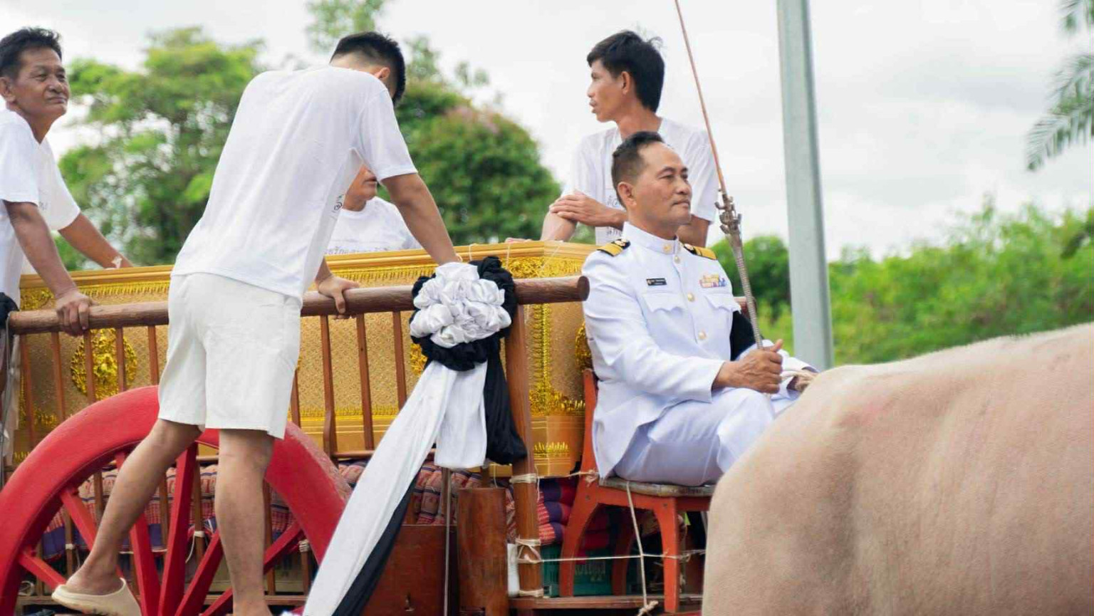 ผู้สื่อข่าวรายงานว่า กลุ่มกำนันและผู้ใหญ่พนัสนิคม ร่วมกันทดแทนพระคุณคุณปู่ ผู้ซึ่งเป็นสุดที่รักของตระกูลเป็นครั้งสุดท้าย ด้วยการจัดขบวนเคลื่อนย้ายร่างผู้วายชนม์ นำเอาควายเทียมเกวียน จากบ้านไปวัด ระยะทางเกือบ 5 กม. โดยได้รับความสนใจจากชาวบ้านตลอดเส้นทางที่ผ่าน