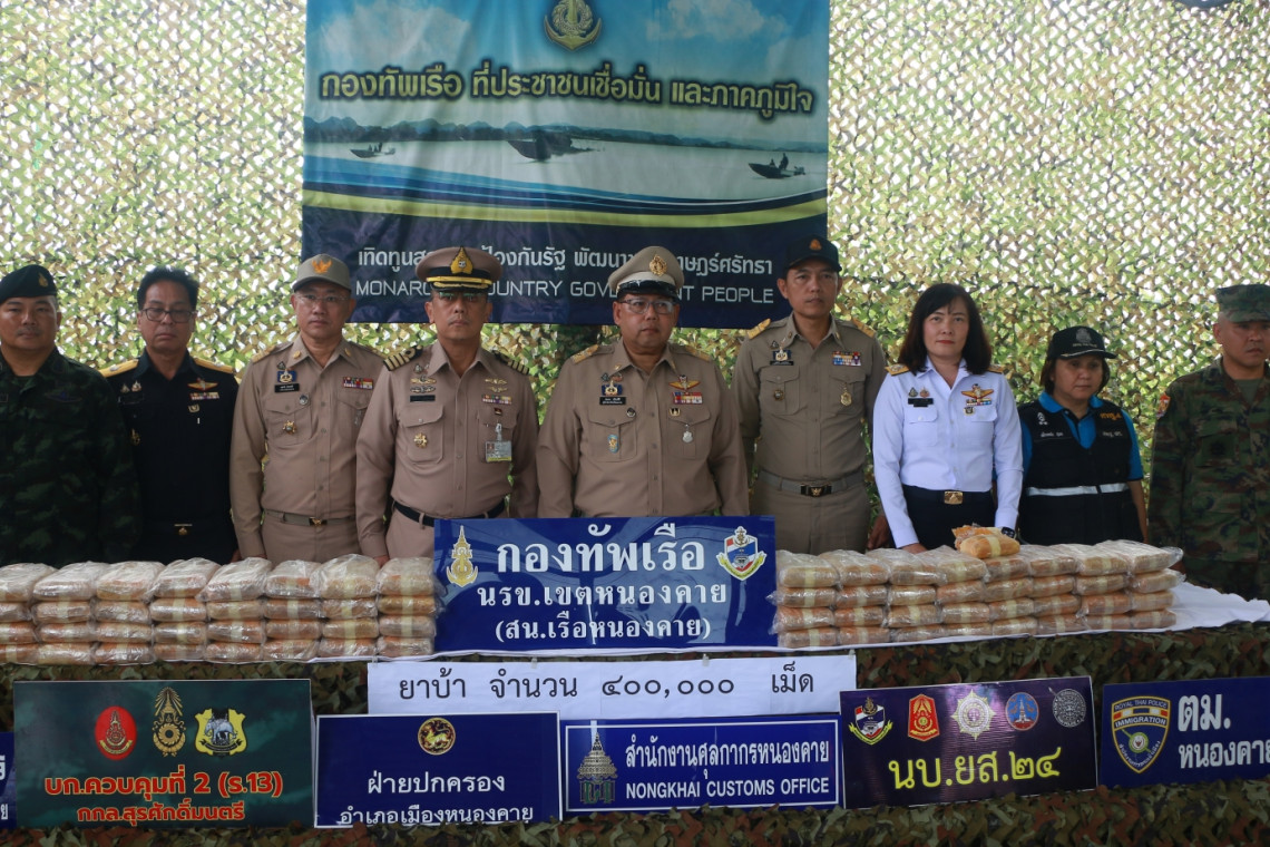 การตรวจยึดครั้งนี้สืบเนื่องจาก เมื่อวันที่ 21 กรกฎาคม 2568 เวลาประมาณ 17.00 น. น.ท.อริยะ ทองมั่น หน.สน.เรือหนองคาย ได้รับแจ้งจากสายลับ ว่าจะมีการลักลอบนำสิ่งผิดกฎหมายจากประเทศเพื่อนบ้าน เข้ามาในประเทศ พื้นที่บ้านสีกาย ต.สีกาย อ.เมืองหนองคาย จึงได้รายงานให้ น.อ.วิศิษฐ์พงศ์ เจริญวิชยเดช ผบ.นรข.เขตหนองคาย ทราบ จากนั้นจึงได้จัดกำลังเฝ้าตรวจและดักซุ่มในบริเวณดังกล่าว ภายใต้การอำนวยการของ พล.ร.ต.ณรงค์ เอมดี ผบ.นรข. กระทั่งเวลาประมาณ 00.15 น. เจ้าหน้าที่ ได้ยินเสียงเรือหางยาวแล่นมาจากฝัง สปป.ลาว จึงใช้กล้องส่องเวลากลางคืนตรวจสอบพบเรือหางยาว 1 ลำ แล่นมาจากฝั่ง สปป.ลาว จากนั้นได้ดับเครื่องยนต์ลอยมุ่งหน้ามายังฝั่งประเทศไทย สักพักได้ติดเครื่องยนต์แล้วแล่นกลับ สปป.ลาว เจ้าหน้าที่ซึ่งดักซุ่มอยู่จึงได้เข้าตรวจสอบบริเวณที่เรือเข้ามาจอดดังกล่าว ที่บันไดเขื่อนป้องกันตลิ่งริมฝังแม่น้ำโขง พบกระสอบสีเทา 1 กระสอบ วางอยู่ จึงได้เปิดดูพบเป็นยาบ้า จึงได้นำของกลางทั้งหมดมาที่ สถานีเรือหนองคายเพื่อตรวจนับอย่างละเอียด รวมยาบ้าที่ตรวจยึดได้ครั้งนี้ จำนวนประมาณ 400,000 เม็ด ก่อนนำของกลางทั้งหมด ส่ง สภ.บ้านเดื่อ เพื่อดำเนินการตามกฎหมาย ต่อไป