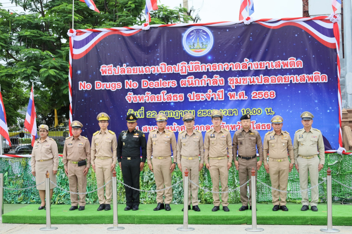 วันที่ 22 กรกฎาคม 2568 เวลา 16.00 น. ณ สนามหน้าศาลากลางจังหวัดยโสธร นายชาญชัย ศรศรีวิชัย ผู้ว่าราชการจังหวัดยโสธร เป็นประธานในพิธีปล่อยแถวเปิดปฏิบัติการกวาดล้างยาเสพติด "No Drugs No Dealers ผนึกกำลัง ชุมชนปลอดยาเสพติด" โดยมีนายสมชัย บูรณะ ปลัดจังหวัดยโสธร ในฐานะเลขานุการศูนย์อำนวยการป้องกันและปราบปรามยาเสพติดจังหวัดยโสธร (ศอ.ปส.จ.ยส.) กล่าวรายงาน พร้อมด้วย หัวหน้าส่วนราชการ และชุดปฏิบัติการจากหน่วยงานต่างๆ เข้าร่วมพิธีอย่างพร้อมเพรียง