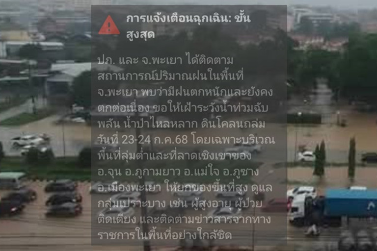 เมื่อวันที่ 23 ก.ค.68 เพจเฟซบุ๊ก "พะเยาบ้านฉัน" โพสต์รูป พร้อมข้อความ ระบุว่า #ด่วน!!! #ระบบได้เตือนภัยแจ้ง ของ ปภ.แจ้งSMS ในระบบมือถือทุกเครือข่าย เข้ามาเมื่อ 9.48น. พื้นที่พะเยา ให้เฝ้าระวังตามจุดดังกล่าว