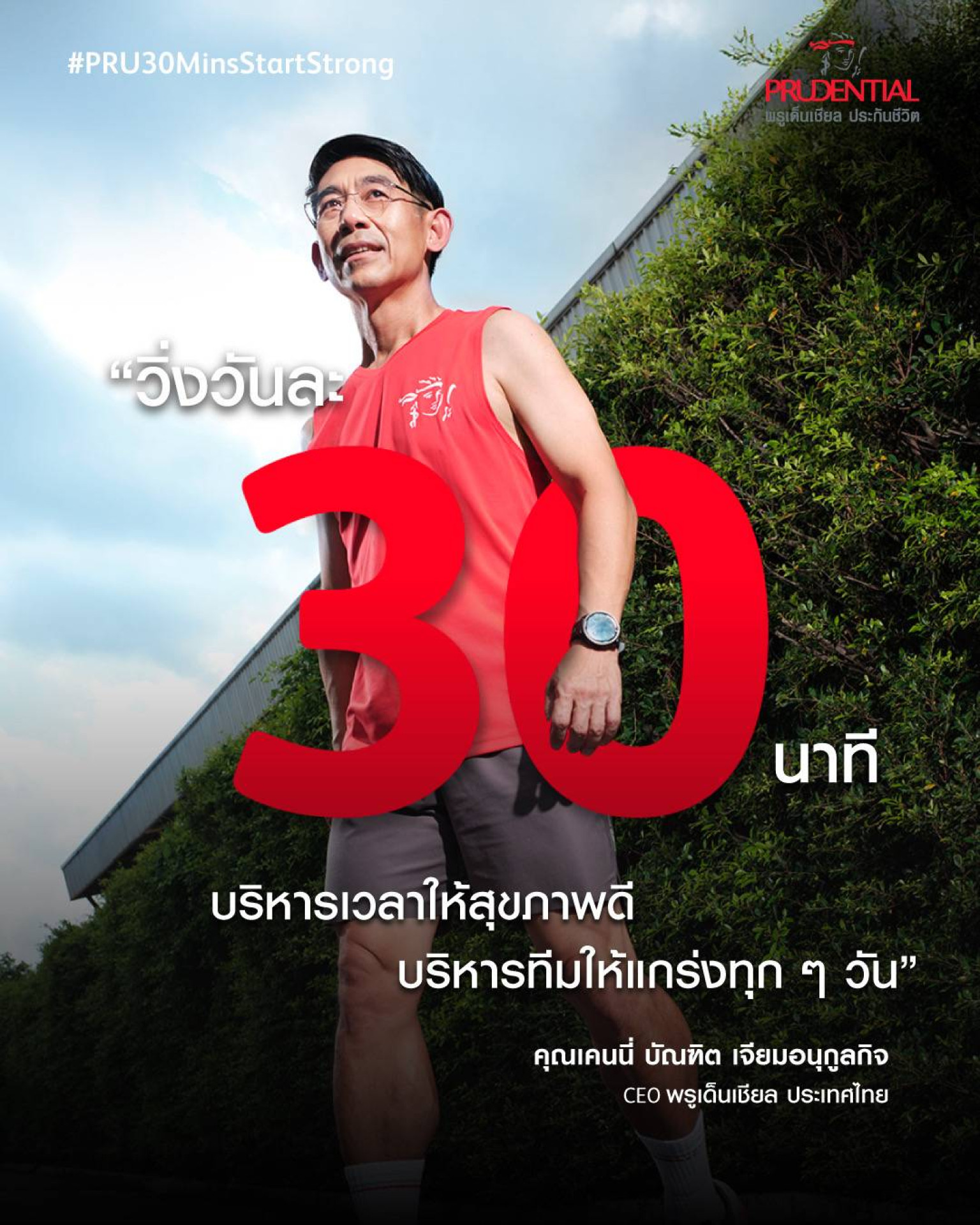 นายบัณฑิตเจียมอนุกูลกิจ ประธานเจ้าหน้าที่บริหาร พรูเด็นเชียล ประเทศไทยกล่าวว่า “ผมเชื่อว่าพลังของมนุษย์เริ่มต้นจากความเชื่อมั่นและการดูแลตัวเองก่อนเสมอ การที่เราเริ่มต้นเช้าวันใหม่ด้วยความแข็งแรง ไม่เพียงแต่จะส่งผลดีต่อร่างกาย แต่ยังเป็นการสร้างกรอบความคิด (mindset) ที่ดีและพร้อมรับมือกับทุกสิ่งไปตลอดทั้งวัน แคมเปญ #PRU30MinsStartStrong คือจุดเริ่มต้นเล็กๆ ที่อยากเชิญชวนให้ทุกคนมาสร้างการเปลี่ยนแปลงที่ยิ่งใหญ่ไปด้วยกัน เพราะสุขภาพที่ดีคือหลักประกันแรกของชีวิต รวมถึงปีนี้ถือว่ามีความพิเศษอย่างยิ่ง เนื่องจากเป็นปีแห่งการฉลองครบรอบ 30 ปีของการดำเนินธุรกิจในประเทศไทย จึงอยากเชิญชวนทุกคนหันมาขยับร่างกายวันละ 30นาที โดยสามารถเริ่มต้นง่ายๆได้ทันที ไม่ว่าจะเป็น การเดิน วิ่งช้าๆ โยคะ หรือ แม้แต่การยืดเหยียดเบาๆ ก็สามารถสร้างความเปลี่ยนแปลงให้ร่างกายวันละนิดเพื่อมีสุขภาพดีไปด้วยกัน”