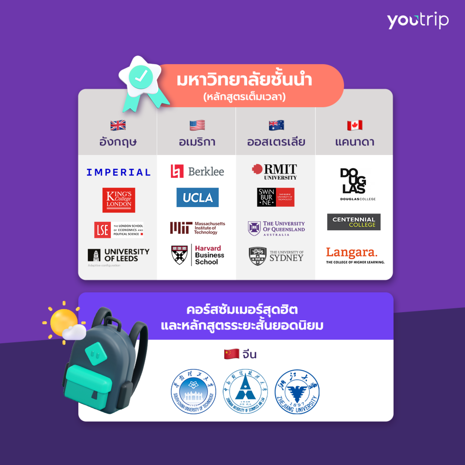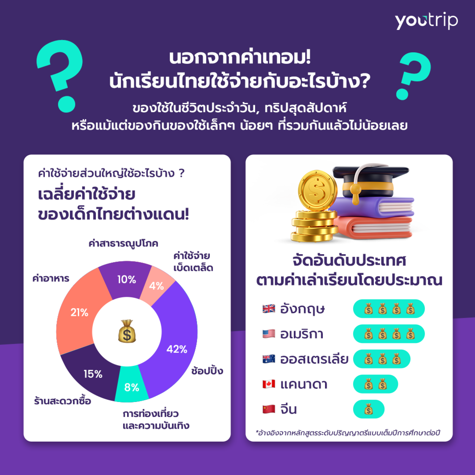 การชำระค่าเล่าเรียนสถาบันการศึกษาชั้นนำใน สหราชอาณาจักร สหรัฐอเมริกา จีน และประเทศต่างๆ ทั่วโลก YouTrip ตอบโจทย์ในการใช้จ่ายเป็นสกุลเงินต่างประเทศด้วยเรทที่ดี ไม่มีค่าธรรมเนียม 2.5% ต่างจากบัตรเครดิต จึงกลายเป็นผลิตภัณฑ์หลักที่นักเรียนไทยเลือกใช้เวลาไปศึกษาต่อต่างประเทศ จากสถิติของ YouTrip ในสหราชอาณาจักร (UK) นักเรียนไทย 54% ที่ศึกษาอยู่ที่นั่นใช้ YouTrip เป็นช่องทางการชำระเงินหลักสำหรับค่าเล่าเรียนและค่าใช้จ่ายประจำวัน สถาบันชั้นนำที่นักเรียนไทยนิยม ได้แก่ Imperial College London, King’s College London, London School of Economics และ Leeds University นอกจาก UK แล้ว นักเรียนไทยยังคงเลือกศึกษาต่อในหลักสูตรเต็มเวลา (ระดับปริญญาตรี โท และเอก) ในสหรัฐอเมริกา (US) ออสเตรเลีย และแคนาดา โดยมีนักเรียนไทยเข้าศึกษาต่อในสถาบันที่มีชื่อเสียงต่างๆ เช่น