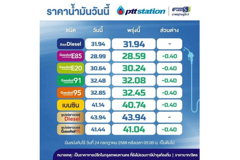 23 กรกฎาคม 2568 19:25 น. สยามรัฐออนไลน์ เศรษฐกิจ ไม่ต้องรีบ! พรุ่งนี้น้ำมันเบนซินและโซฮอล์ลง 40 สต./ลิตร ปตท.และบางจาก ประกาศปรับลดราคาน้ำมันเบนซินและแก๊สโซฮอล์ 40 สตางค์ต่อลิตร ส่วนน้ำมันดีเซลไม่มีการเปลี่ยนแปลง โดยมีผลวันพรุ่งนี้ ( 24 ก.ค.) เวลา 05.00 น.