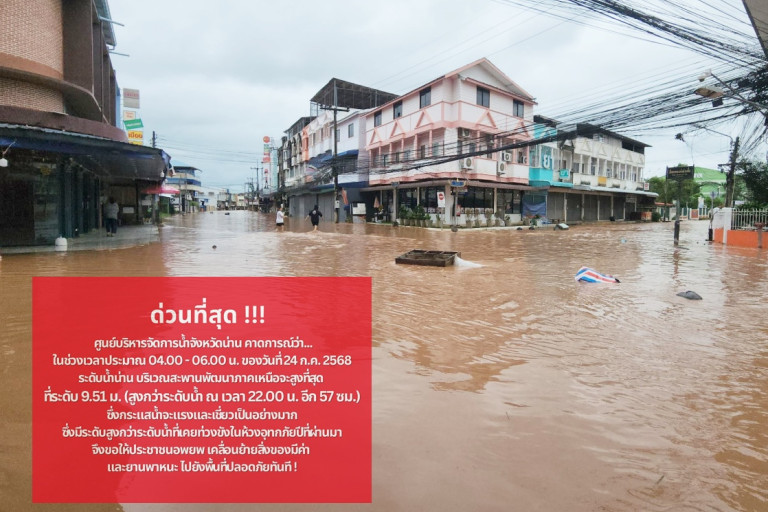 ในช่วงเวลาประมาณ 04.00 - 06.00 น. ของวันที่ 24 ก.ค. 2568 ระดับน้ำน่าน บริเวณสะพานพัฒนาภาคเหนือจะสูงที่สุด ที่ระดับ 9.51 ม. (สูงกว่าระดับน้ำ ณ เวลา 22.00 น. อีก 57 ซม.) ซึ่งกระแสน้ำจะแรงและเชี่ยวเป็นอย่างมาก ซึ่งมีระดับสูงกว่าระดับน้ำที่เคยท่วมขังในห้วงอุทกภัยที่ผ่านมา