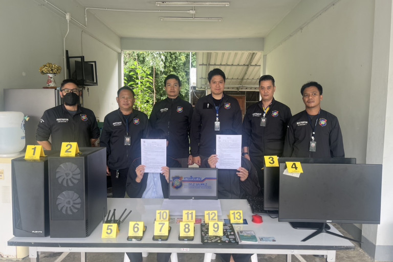 ของกลางที่ยึดได้ ได้แก่ คอมพิวเตอร์ตั้งโต๊ะ โทรศัพท์มือถือ เราเตอร์อินเทอร์เน็ต และสมุดบัญชีธนาคารจำนวนมาก นอกจากนี้ จากการตรวจสอบหนังสือเดินทางของชายชาวเมียนมา พบว่าอยู่ในราชอาณาจักรโดยวีซ่าหมดอายุถึง 202 วัน (Overstay)