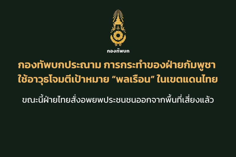 วันที่ 24 ก.ค.68 กองทัพบกขอประณามการกระทำอันรุนแรงและไร้มนุษยธรรมของฝ่ายกัมพูชา จากกรณีที่มีการใช้อาวุธจรวด BM-21 จำนวน 2 นัด ยิงเข้ามาในพื้นที่ชุมชนภายในศูนย์พัฒนาพื้นที่ชายแดน อำเภอกาบเชิง จังหวัดสุรินทร์ เมื่อเวลา 09.40 น. ของวันนี้ (24 ก.ค.) เหตุการณ์ดังกล่าวส่งผลให้ราษฎรได้รับบาดเจ็บจำนวน 3 ราย ซึ่งฝ่ายไทยได้ดำเนินการอพยพประชาชนออกจากพื้นที่โดยทันที เพื่อความปลอดภัยของชีวิตและทรัพย์สิน