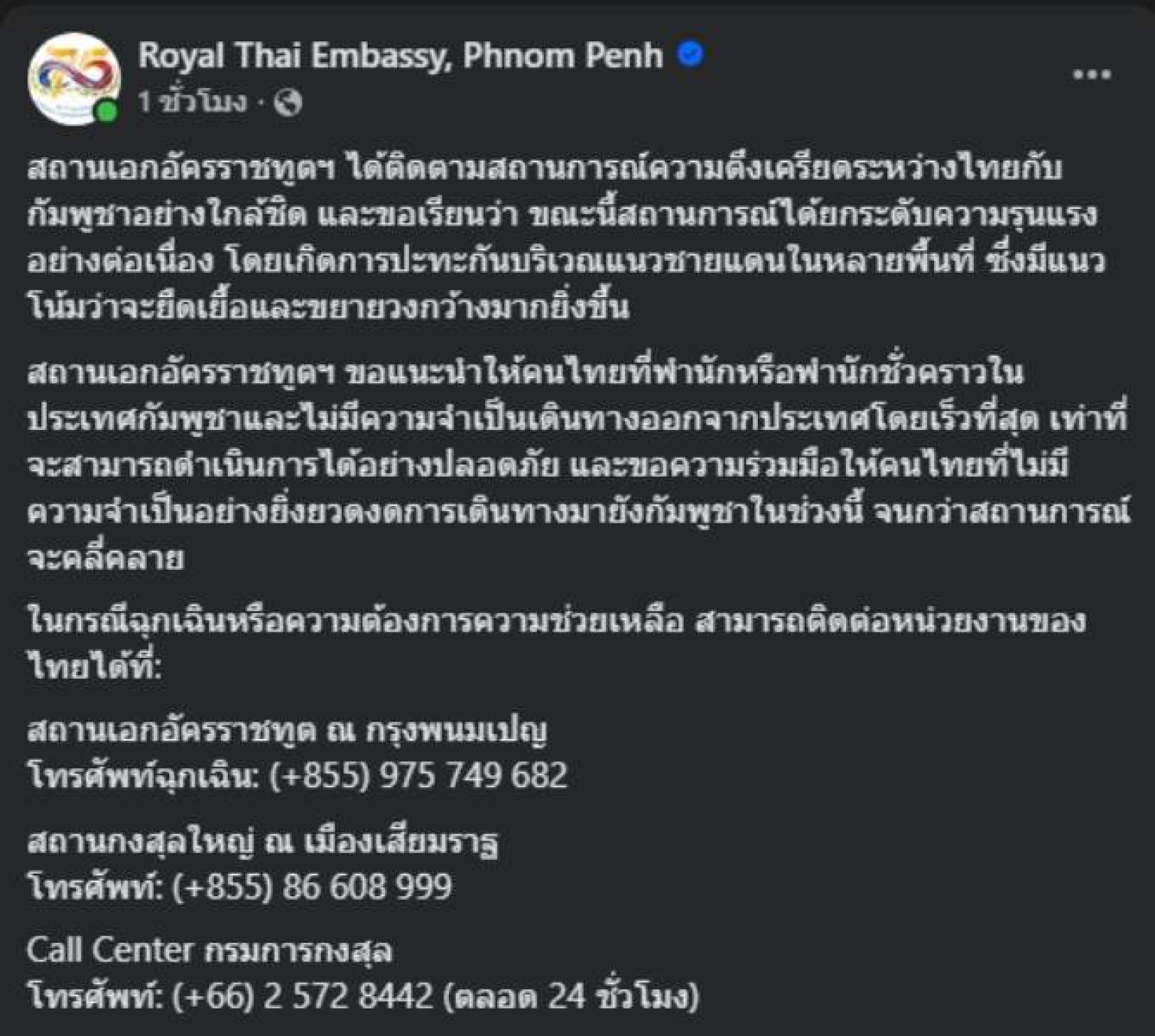 ล่าสุด สถานเอกอัครราชทูตไทยในพนมเปญ ออกประกาสผ่านเพจเฟซบุ๊ก Royal Thai Embassy Phanom Penh ระบุว่า...