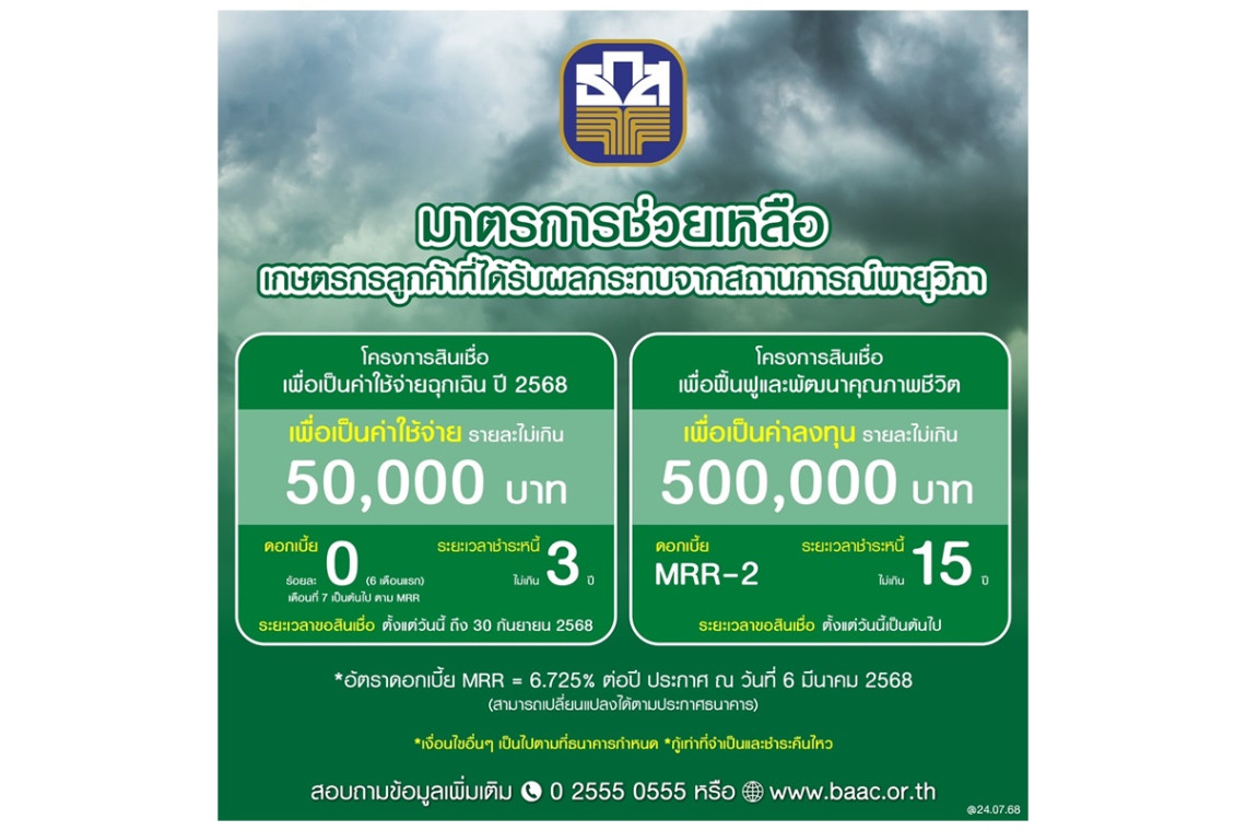 ธ.ก.ส. เร่งช่วยเหลือผู้ประสบอุทกภัยภาคเหนือ จัดมาตรการช่วยเหลือลูกค้าโดยเปิดโอกาสให้สามารถเลื่อนการชำระหนี้ออกไปสูงสุดไม่เกิน 1 ปี โดยไม่คิดดอกเบี้ยปรับ และมาตรการฟื้นฟูและเสริมสภาพคล่องเกษตรกร วงเงินรวม 20,000 ล้านบาท ผ่านสินเชื่อเพื่อเป็นค่าใช้จ่ายฉุกเฉิน 2568 วงเงินรายละไม่เกิน 50,000 บาท ดอกเบี้ย 0% 6 เดือนแรก และสินเชื่อฟื้นฟูและพัฒนาคุณภาพชีวิต วงเงินรายละไม่เกิน 500,000 บาท ดอกเบี้ย MRR-2 พร้อมเตรียมลงพื้นที่สำรวจความเสียหายให้กับลูกค้าหลังน้ำลด เพื่อรวบรวมข้อมูลและวางแนวทางในการให้ความช่วยเหลืออื่นๆต่อไป