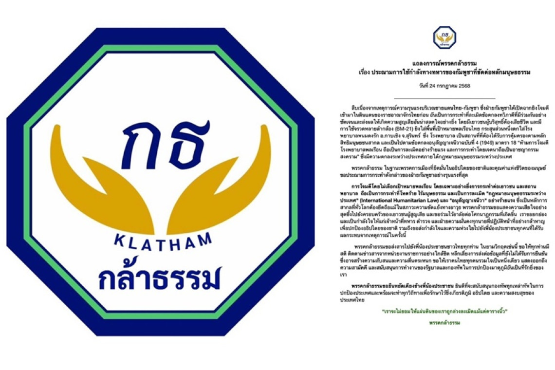 พรรคกล้าธรรม ในฐานะพรรคการเมืองที่ยึดมั่นในอธิปไตยของชาติและคุณค่าแห่งชีวิตของมนุษย์ ขอประณามการกระทำดังกล่าวของฝ่ายกัมพูชาอย่างรุนแรงที่สุด