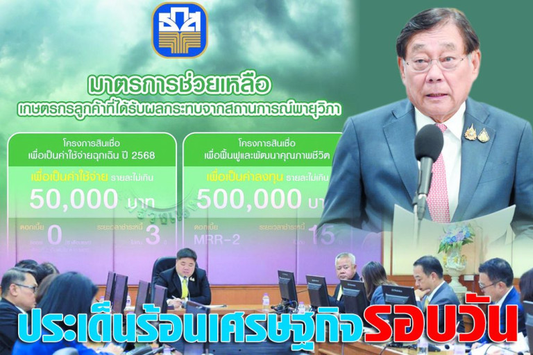 -ธ.ก.ส. เร่งช่วยเหลือผู้ประสบอุทกภัยภาคเหนือที่น้ำท่วมจากพายุวิภา เปิดโอกาสให้เลื่อนชำระหนี้ออกไปสูงสุดไม่เกิน 1 ปี ไม่คิดดอกเบี้ยปรับ และมาตรการฟื้นฟูและเสริมสภาพคล่องเกษตรกร วงเงินรวม 20,000 ล้านบาท วงเงินรายละไม่เกิน 5 หมื่นบาท ดอกเบี้ย 0% 6 เดือนแรก และสินเชื่อฟื้นฟูและพัฒนาคุณภาพชีวิต วงเงินรายละไม่เกิน 5 แสนบาท ดอกเบี้ย MRR-2