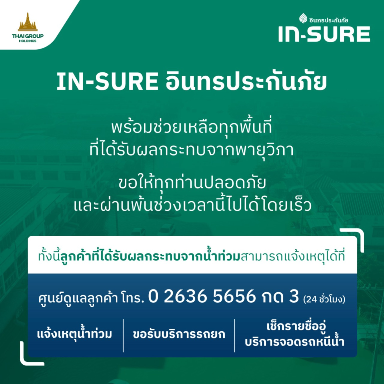 จากสถานการณ์ความรุนแรงของพายุวิภา ทำให้เกิดฝนตกหนักถึงหนักมาก โดยเฉพาะในพื้นที่ภาคเหนือของประเทศไทย ซึ่งได้รับผลกระทบมากที่สุดในขณะนี้ บริษัท อินทรประกันภัย จำกัด (มหาชน) หรือ IN-SURE หนึ่งในสายธุรกิจหลักของบริษัท ไทยกรุ๊ป โฮลดิ้งส์ จำกัด (มหาชน) กลุ่มธุรกิจประกันและการเงินในเครือทีซีซี ขอแสดงความห่วงใย และเร่งให้ความช่วยเหลือลูกค้าผู้เอาประกันภัยที่ได้รับผลกระทบเพื่อบรรเทาความเดือดร้อน ด้วยการจัดส่งทีมเจ้าหน้าที่สินไหมลงพื้นที่ภาคเหนือทันที พร้อมเพิ่มช่องทางการติดต่อ เปิดรับแจ้งเหตุและให้คำปรึกษาตลอด 24 ชั่วโมง นอกจากนี้ บริษัทฯ ได้ออกมาตรการช่วยเหลือลูกค้าในพื้นที่เสี่ยงภัยอย่างเร่งด่วน ตั้งแต่การขอรับบริการรถยก รถลากจูงเพื่อเคลื่อนย้ายรถยนต์ออกจากพื้นที่เสี่ยงภัยไปอยู่ในพื้นที่ปลอดภัย และได้ร่วมกับอู่คู่สัญญาในการให้บริการรับฝากจอดรถหนีน้ำท่วมให้กับลูกค้าอีกด้วย ทั้งนี้ ลูกค้า IN-SURE อินทรประกันภัย สามารถแจ้งเหตุน้ำท่วม หรือ ขอรับบริการรถยก ได้ที่ศูนย์บริการลูกค้าสัมพันธ์ Call Center โทร. 02-636-5656 กด 3 ตลอด 24 ชั่วโมง