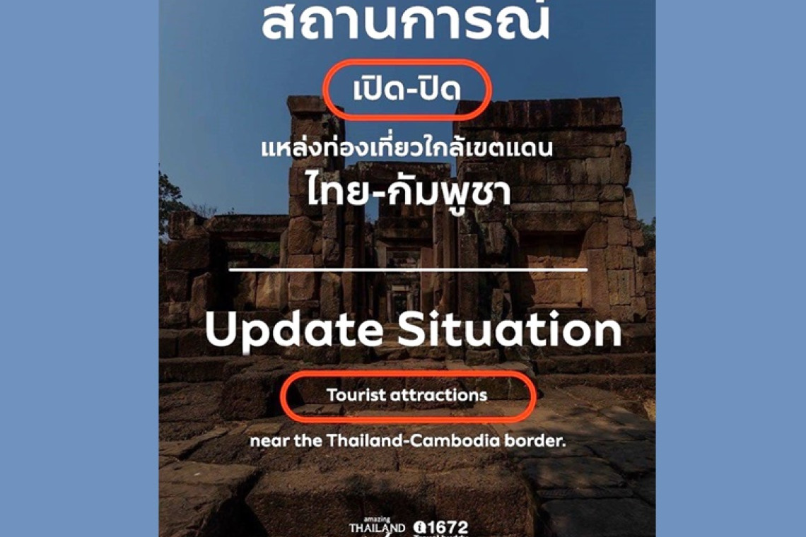 โดย การท่องเที่ยวแห่งประเทศไทย (ททท.) ได้อัพเดตข้อมูลวันที่ 24 กรกฎาคม 2568 หลังเกิดเหตุปะทะสร้างความไม่สงบตามแนวชายแดนไทย-กัมพูชา ซึ่งไทยมีพื้นที่เขตติดต่อกับกัมพูชา และมีแหล่งท่องเที่ยวรวมอยู่ด้วย ใน 7 จังหวัด ด้วยการแนะนำนักเดินทางเพื่อความปลอดภัย ไม่ควรเข้าไปในระหว่างนี้ 25 พื้นที่