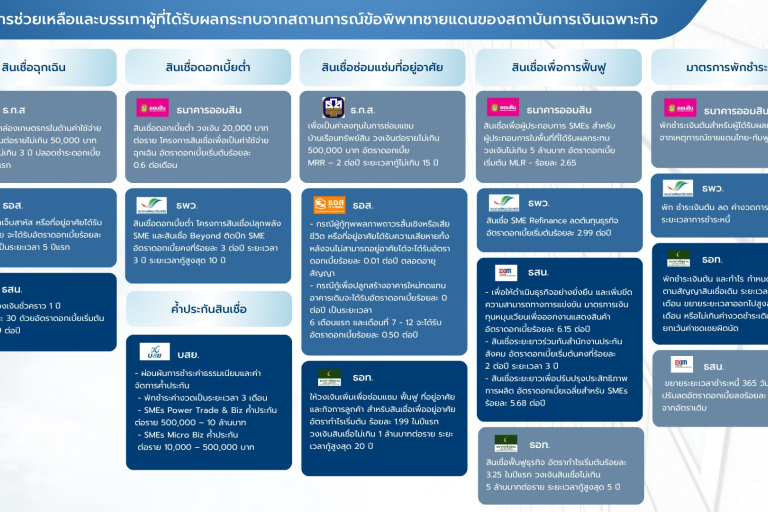- มาตรการ SMEs Power Trade & Biz วงเงินค้ำประกัน 3,000 ล้านบาท วงเงินค้ำประกันต่อราย 500,000 – 10 ล้านบาท เพื่อบรรเทาความเดือนร้อนสำหรับผู้ได้รับผลกระทบจากเหตุการณ์ชายแดนไทย – กัมพูชา