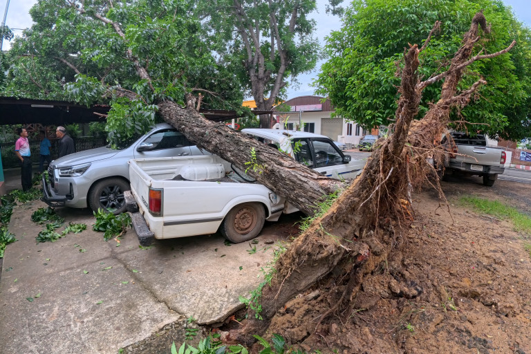 ยโสธรฝนตกลมพัดแรงทำให้ต้นไม้ใหญ่ล้มทับรถยนต์กระบะเสียหาย 2 คัน