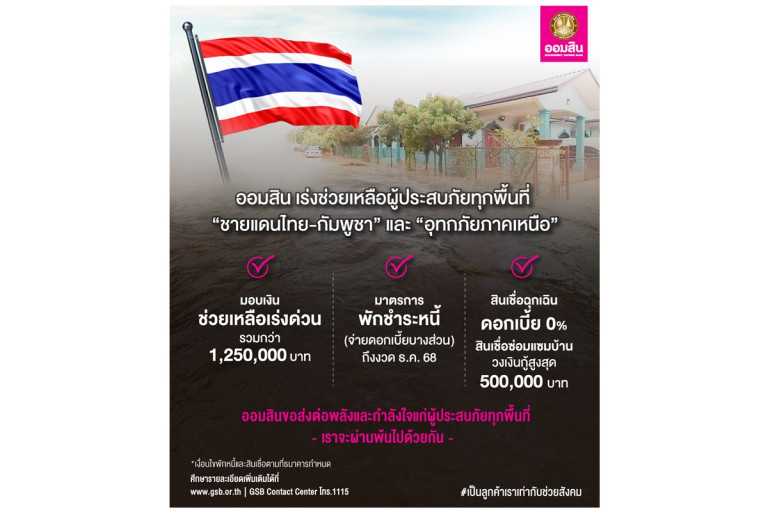 ออมสิน เร่งให้ความช่วยเหลือมอบเงินสนับสนุนบรรเทาความเดือดร้อนเฉพาะหน้ากรณีสถานการณ์สู้รบชายแดนไทยกัมพูชา และอุทกภัยภาคเหนือตอนบน พร้อมออกมาตรการพักชำระหนี้ลดภาระ และให้สินเชื่อเพื่อผู้ประสบภัยที่ได้รับผลกระทบ