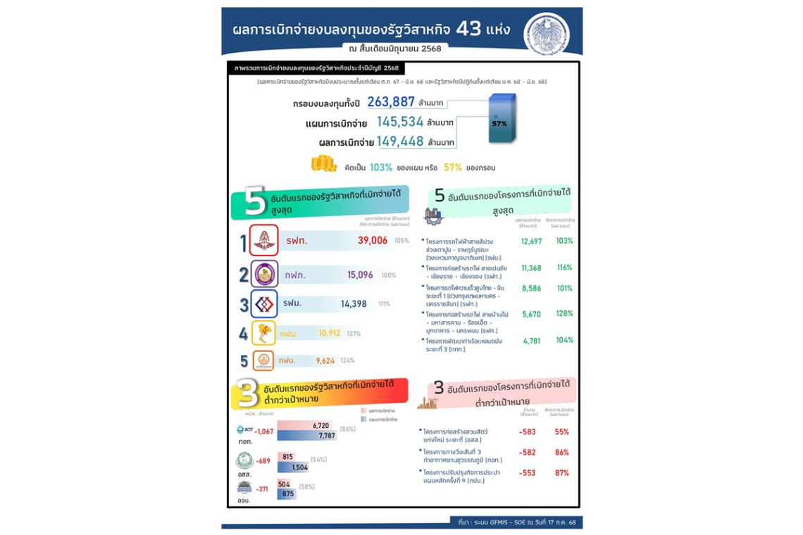 วันที่ 25 ก.ค.68 นายธิบดี วัฒนกุล ผู้อำนวยการสำนักงานคณะกรรมการนโยบายรัฐวิสาหกิจ (สคร.) เปิดเผยว่า การเบิกจ่ายงบลงทุนของรัฐวิสาหกิจที่อยู่ในการติดตามของ สคร. อย่างใกล้ชิด จำนวน 43 แห่ง แบ่งออกเป็น 2 กลุ่ม ได้แก่ กลุ่มรัฐวิสาหกิจที่ใช้ปีบัญชีตามปีงบประมาณ (รัฐวิสาหกิจปีงบประมาณ) และกลุ่มรัฐวิสาหกิจที่ใช้ปีบัญชีตามปีปฏิทิน (รัฐวิสาหกิจปีปฏิทิน) โดยในปี 2568 มีกรอบงบลงทุน จำนวน 263,887 ล้านบาท และมีผลการเบิกจ่ายสะสมจนถึงสิ้นเดือนมิถุนายน 2568 จำนวน 149,448 ล้านบาท หรือคิดเป็นร้อยละ 103 ของแผนการเบิกจ่าย ประกอบด้วยผลการเบิกจ่ายงบลงทุนของรัฐวิสาหกิจปีงบประมาณ (ตั้งแต่เดือนตุลาคม 2567 - เดือนมิถุนายน 2568) 34 แห่ง จำนวน 95,162 ล้านบาท หรือคิดเป็นร้อยละ 100 ของแผนการเบิกจ่าย และรัฐวิสาหกิจปีปฏิทิน (ตั้งแต่เดือนมกราคม 2568 - เดือนมิถุนายน 2568) 9 แห่ง จำนวน 54,286 ล้านบาท หรือคิดเป็นร้อยละ 109 ของแผนการเบิกจ่าย