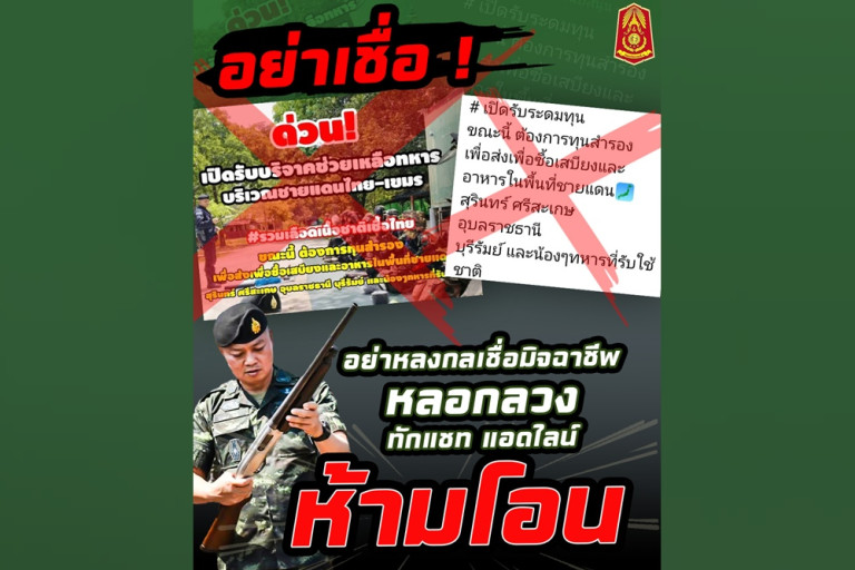 วันที่ 25 ก.ค.68 เพจ กองทัพภาคที่ 2 โพสต์ข้อความระบุว่า "เตือนภัย!!! เพจปลอมระบาดหนัก ใช้ชื่อกองทัพภาคที่ 2 เปิดรับเงิน" และ "มิจฉาชีพ 100%" ... "สถานการณ์หน้าสิ่วหน้าขวานเช่นนี้ มิจฉาชีพยังป่วน ทั้งนี้ กองทัพภาคที่ 2 ไม่มีนโยบายเปิดรับบริจาคหรือเรี่ยไรเงินทุกกรณี เพราะเป้าหมายงานตอนนี้ คือความปลอดภัยของพี่น้องประชาชนและการปกป้องอธิปไตยเหนือชีวิต"