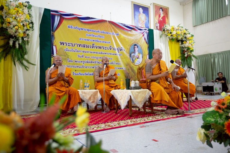 จากนั้น พระครูปลัดสิทธิวัฒน์ (หลวงพี่น้ำฝน) ผู้รักษาการแทนเจ้าอาวาสวัดไผ่ล้อม พระอารามหลวง จังหวัดนครปฐม และคณะสงฆ์วัดไผ่ล้อมฯ นำเข้าสู่พิธีเจริญพระพุทธมนต์เฉลิมพระเกียรติ (บทรัตนปริตร) ถวายพระพรชัยมงคล และพิธีถวายสัตย์ปฏิญาณเพื่อเป็นข้าราชการที่ดีของแผ่นดิน แด่พระบาทสมเด็จพระเจ้าอยู่หัว เนื่องในโอกาสมหามงคลเฉลิมพระชนมพรรษา วันที่ 28 กรกฎาคม 2568 เป็นจบพิธี