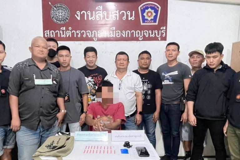 เมื่อวันที่ 25 กรกฏาคม 2568 เวลา 07.30 น. ภายใต้การอำนวยการของนายอธิสรรค์ อินทร์ตรา ผู้ว่าราชการจังหวัด ,นายวุฒิพงษ์ สุภัควนิช รองผู้ว่าราชการจังหวัด ,นายฑรัท เหลืองสอาด ปลัดจังหวัด และพ.ต.อ.สุรยุทธ เมฆมังกร ผกก.สภ.เมืองกาญจนบุรีได้สั่งการให้นายสุวัฒนา ม่วงหวาน ป้องกันจังหวัด,มว.ต.วุฒิภัทร คงสมัย รองผบ.ร้อย.อส.จ.กจ.1 ,พ.ต.ท.วศิน พลายศิริ รองผกก.สส.สภ.เมืองกาญจนบุรี ,พ.ต.ต.มารุต ฉัตรทัณฑ์ สว.สส.สภ.เมืองกาญจนบุรี พร้อมด้วยสมาชิกอส.และเจ้าหน้าที่ตำรวจชุดสืบสวน สภ.เมืองกาญจนบุรี ได้ร่วมกันจับกุมตัวผู้กระทำความผิด มียาเสพติดให้โทษประเภท 1 เมทแอมฟีตะมีน(ยาบ้า) การมีไว้เพื่อจำหน่ายโดยไม่ได้รับอนุญาต