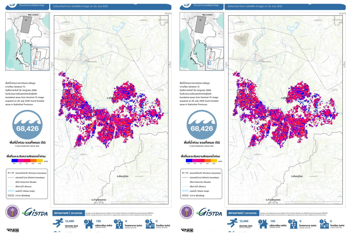 กระทรวงการอุดมศึกษา วิทยาศาสตร์ วิจัยและนวัตกรรม (อว.) โดย GISTDA ติดตามสถานการณ์น้ำท่วมขังด้วยข้อมูลจากดาวเทียม Sentinel-1C ของวันที่ 26 กรกฎาคม 2568 พบว่าขณะนี้มีพื้นที่บางส่วนของจังหวัด #สุโขทัย ที่ได้รับผลกระทบทั้งสิ้น 68,426 ไร่ ซึ่งพื้นที่ที่พบส่วนใหญ่เป็นพื้นที่ลุ่มต่ำ พื้นที่การเกษตร พื้นที่ริมสองฝั่งแม่น้ำสายหลักและสายรอง รวมถึงชุมชนที่อยู่อาศัยและเส้นทางคมนาคมบางส่วน ทั้งนี้ ระดับน้ำท่วมขังจะมีความลึกแตกต่างกันไปตามลักษณะของแต่ละพื้นที่